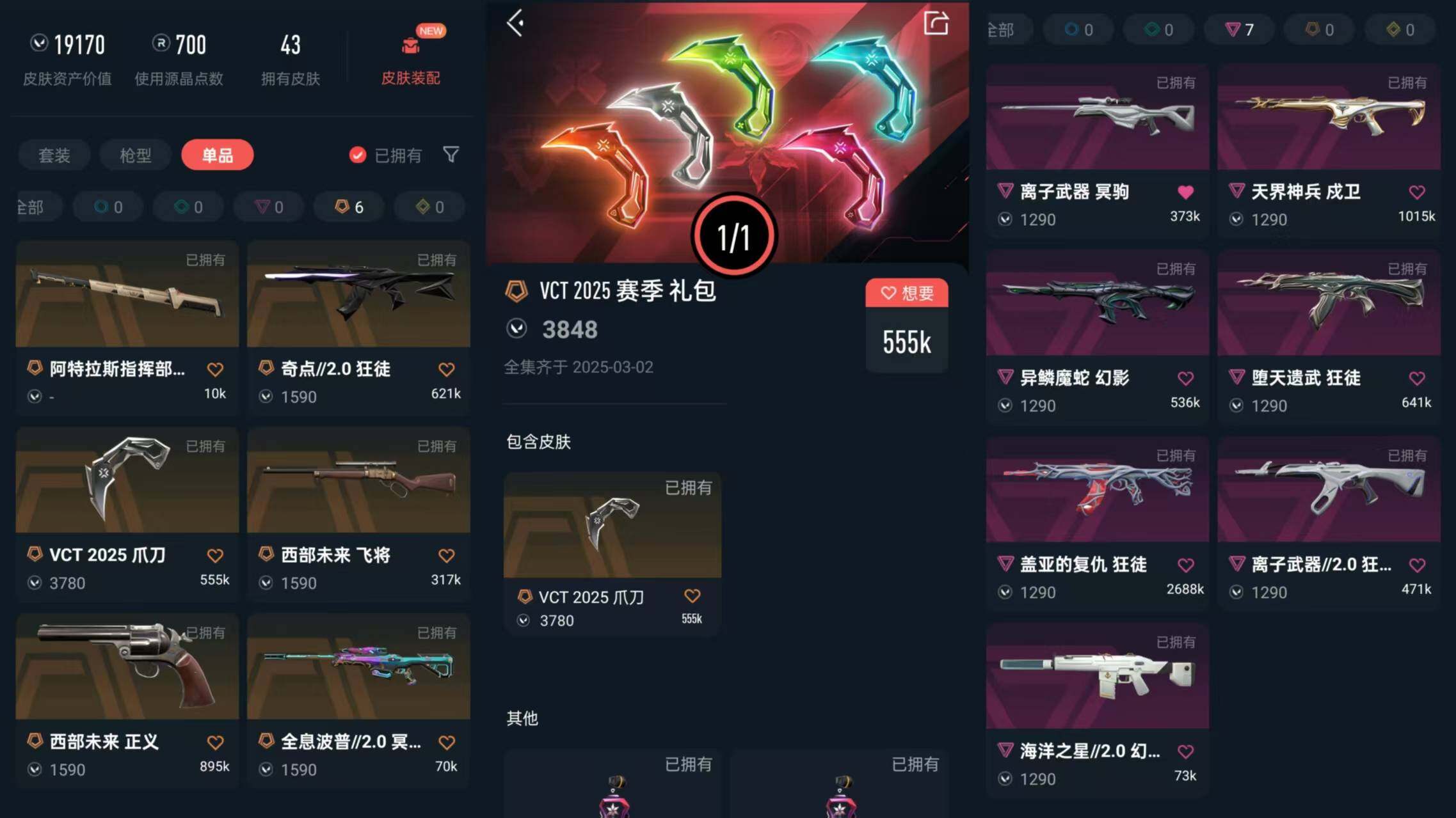 【WOX25120】 | 皮肤资产价值:19170 | VCT2025爪刀 | 神圣领域幻影,异鳞魔蛇幻影 | 盖亚的复仇狂徒,离子武器2.0狂徒,堕天遗武狂徒,奇点2.0狂徒 | 西部未来正义,月球哨兵正义 | 全息波普2.0冥驹,离子武器冥驹 | 天界神兵戍卫 | 星云暗涌骇灵 | 神圣领域战神 | 西部未来飞将 | 月球哨兵雄鹿 | 神圣领域狂怒 | 【买号找回永久包赔】