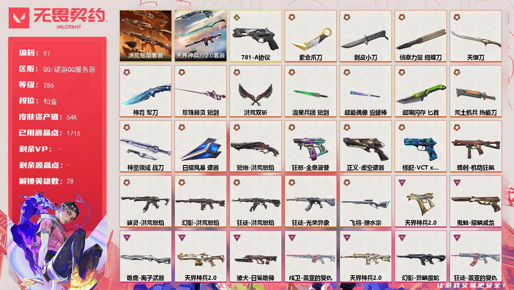 【WSP02385】 | 皮肤资产价值:54490 | 超限闪存匕首,神圣领域战刀,剥皮小刀,超能偶像应援棒,紫金爪刀,侦察力量蝴蝶刀,珍珠棘贝短剑,天御刀,洪荒双斩,荒土机兵热能刀,神罚军刀,日耀风暴遗器,流星兵团短剑,落英飞旋 | 珍珠棘贝幻影,纳米打击幻影,超限闪存幻影,天界神兵2.0幻影,聚合之力幻影,神圣领域幻影,异鳞魔蛇幻影,洪荒怒焰幻影 | 盖亚的复仇狂徒,洪荒怒焰狂徒,超能偶像狂徒,光荣异象狂徒,般若假面2.0狂徒,荒土机兵狂徒,流星兵团狂徒 | 781-A协议正义,超限闪存正义,纳米打击正义,虚空遗器正义,复古浪潮正义,月球哨兵正义,纤云弄巧正义 | 战术熊与伙伴们标配,神罚标配,超能偶像标配,最终庇护标配,浮光跃金标配,VCTxLEV标配,荒土机兵标配 | 模拟赫兹鬼魅,耀鳞威龙鬼魅,诡秘蛇影鬼魅,采蜜小蜂队鬼魅,星云暗涌鬼魅,命运之手鬼魅,流星兵团鬼魅 | 起源冥驹,模拟赫兹冥驹,复古浪潮冥驹 | 天界神兵2.0奥丁,流星兵团奥丁,纳米打击奥丁 | 月球哨兵戍卫,盖亚的复仇戍卫,浮光跃金戍卫,逆冲蛮牛戍卫,战术熊与伙伴们戍卫,珍珠棘贝戍卫,超能偶像戍卫 | 采蜜小蜂队獠犬,模拟赫兹獠犬,日冕雄师獠犬,神圣领域獠犬 | 月球哨兵莽侠,超限闪存莽侠,神中神罚莽侠,深海水族莽侠,纤云弄巧莽侠 | 纳米打击判官,采蜜小蜂队判官,超能偶像判官,天界神兵2.0判官 | 流星兵团骇灵,珍珠棘贝骇灵,浮光跃金骇灵,洪荒怒焰骇灵,星云暗涌骇灵,荒土机兵骇灵 | 深海水族蜂刺,纤云弄巧蜂刺,机动狂飙蜂刺,聚合之力蜂刺,超限闪存蜂刺 | 洪荒怒焰短炮,深海水族短炮,纤云弄巧短炮 | 深海水族战神,神圣领域战神,盖世英雄战神,浮光跃金战神,采蜜小蜂队战神 | 塑水宗飞将,聚合之力飞将,战术熊与伙伴们飞将 | 模拟赫兹雄鹿,离子武器雄鹿,逆冲蛮牛雄鹿,神罚2.0雄鹿,复古浪潮雄鹿,月球哨兵雄鹿 | 天界神兵2.0狂怒,珍珠棘贝狂怒,聚合之力狂怒,战术熊与伙伴们狂怒,神圣领域狂怒,逆冲蛮牛狂怒,全息波普狂怒 | 【买号找回永久包赔】
