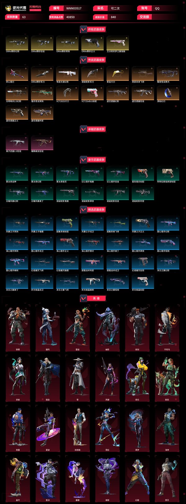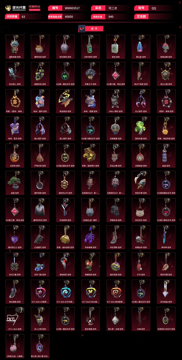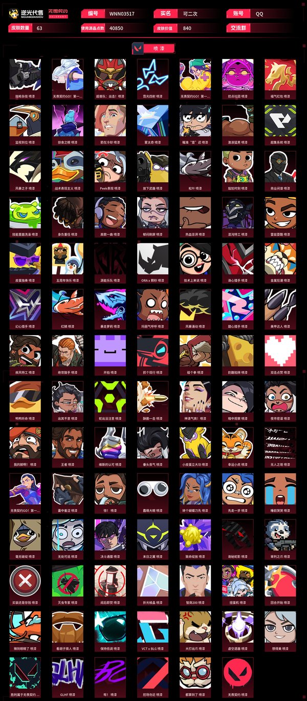【WNN03517】 | 皮肤资产价值:40850 | 枪皮数量:57 | 刀皮数量:6 | 诡秘蛇影军刀,ORAx颗秒军刀,紫金爪刀,源始幻刃,VCT2025爪刀 | 电音光谱幻影,蒙太奇幻影,光明哨兵2.0幻影,日耀风暴幻影,虚空遗器幻影,甜心猎手幻影,末日之翼幻影,ORAx颗秒幻影 | 虚空遗器狂徒,ORAx颗秒狂徒,诡秘蛇影狂徒,幻心猎手狂徒,离子武器2.0狂徒,耀鳞威龙狂徒 | 风暴之子正义,虚空遗器正义,诛心猎手正义,ORAx颗秒正义 | 艾沃莉的梦之翼鬼魅,诡秘蛇影鬼魅,幻心猎手鬼魅 | 偃月苍龙冥驹,诛心猎手冥驹,ORAx颗秒冥驹,风暴之子冥驹 | 诛心猎手奥丁,日耀风暴奥丁,末日之翼奥丁 | 甜心猎手戍卫,折光棱晶戍卫,甜蜜战术戍卫,风暴之子戍卫 | 诛心猎手獠犬,黯夜怪谈獠犬 | 甜心猎手莽侠,诡秘蛇影莽侠 | 诡秘蛇影判官,甜蜜战术判官,虚空遗器判官 | 蒙太奇骇灵 | 甜心猎手蜂刺,折光棱晶蜂刺 | 末日之翼短炮,甜心猎手短炮 | 蒙太奇战神 | 末日之翼飞将,幻语魔咒飞将,超集系统飞将,西部未来飞将 | 幻语魔咒雄鹿,风暴之子雄鹿 | 幻语魔咒狂怒 | 【买号找回永久包赔】
