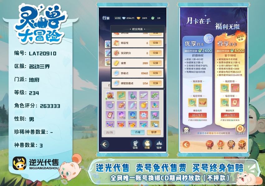 【LAT20910】 | 地府 | 狰,精卫,画中仙 | 等级:234 | 仙器:7 | 貔貅,龙马 | 神兽数量:3 | 角色评分:263333 | 男 | 珍兽数量:2