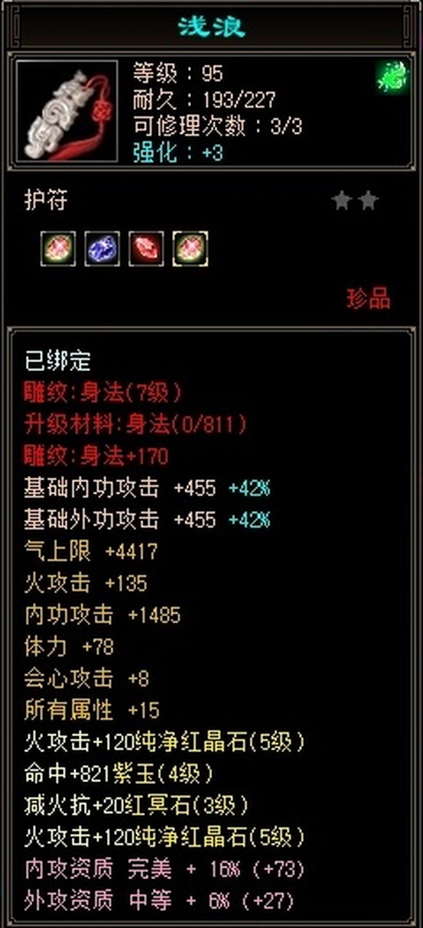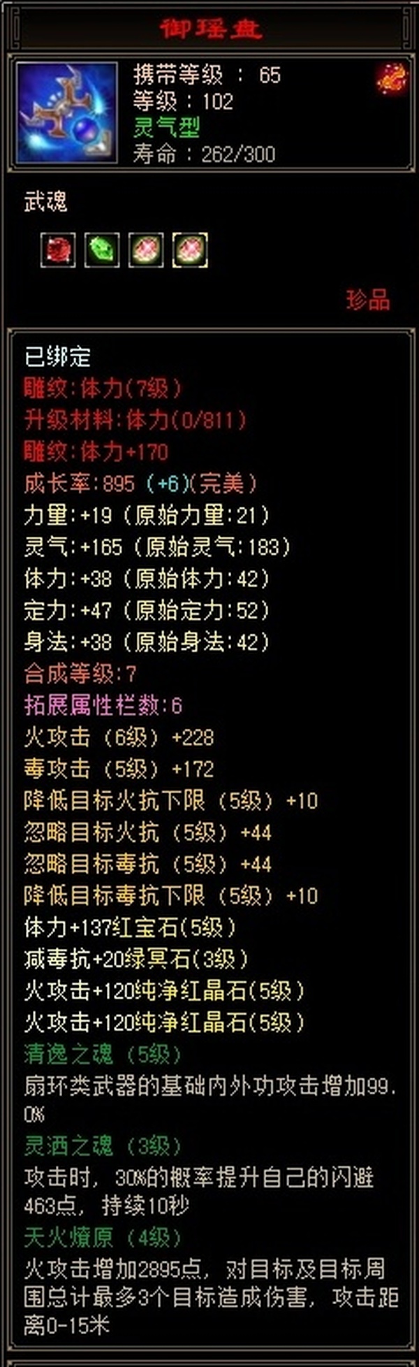 捡漏号,装备满孔,5体5属4减抗,7级雕文,主属性3836,副属性1325,成品双10附体游龙,成品PK宝宝,开暗器附体36万血,完美暗器,武魂,带3100金,多套时装。没时间玩了,有意向的可以来聊聊