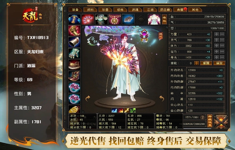 【TXR18913】 | 逍遥 | 等级:69 | 主属性:3207 | 副属性:1781 | 男 | 主火攻