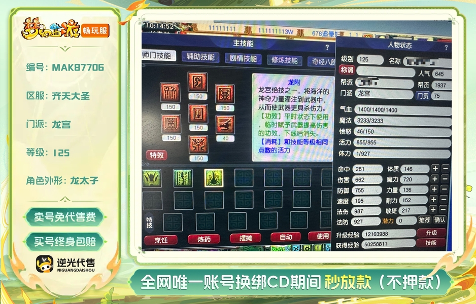 超绿125级飞升龙宫,三修上限24,6个技能150,带豪宅,没时间等CB G,过户无忧