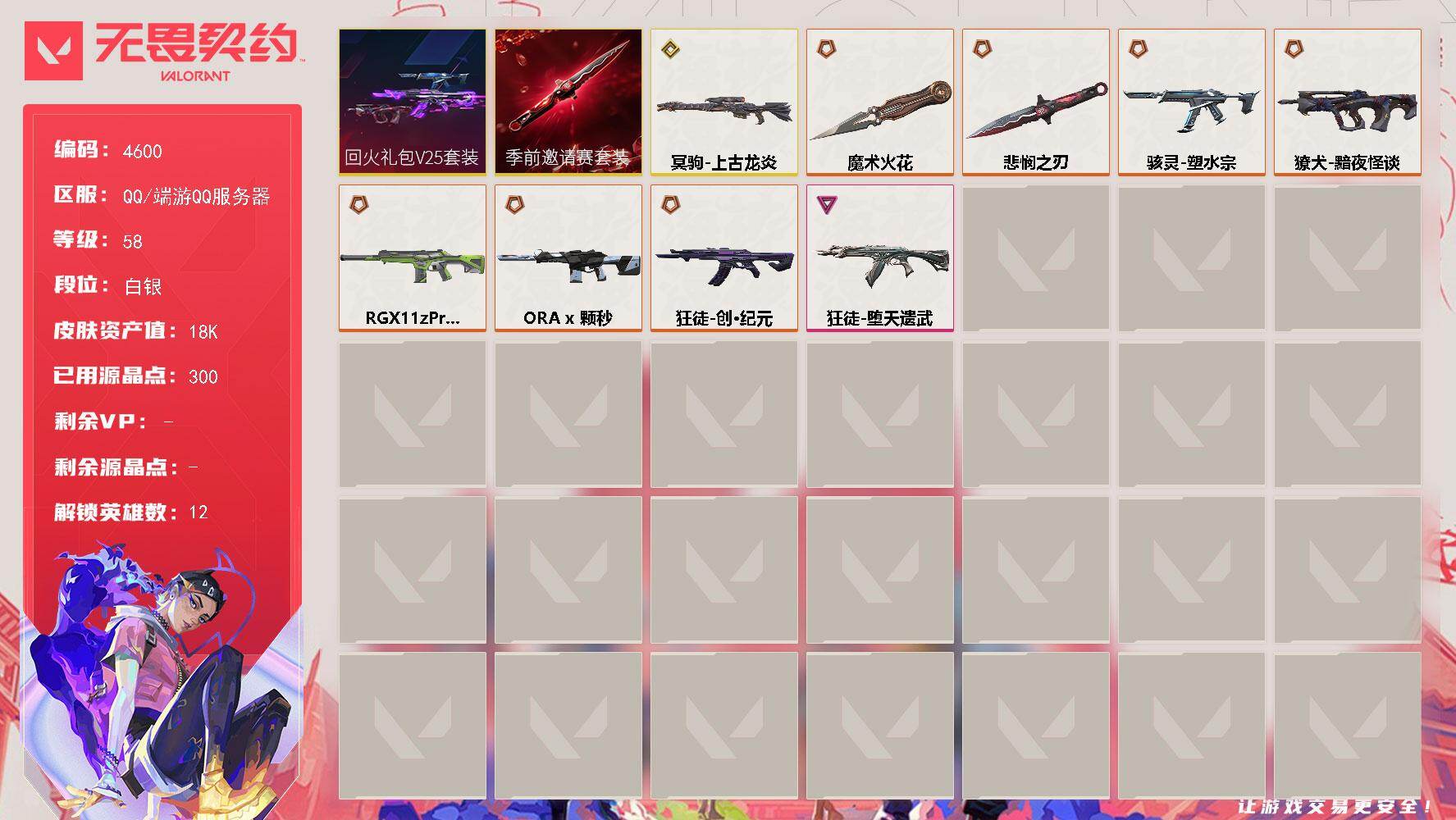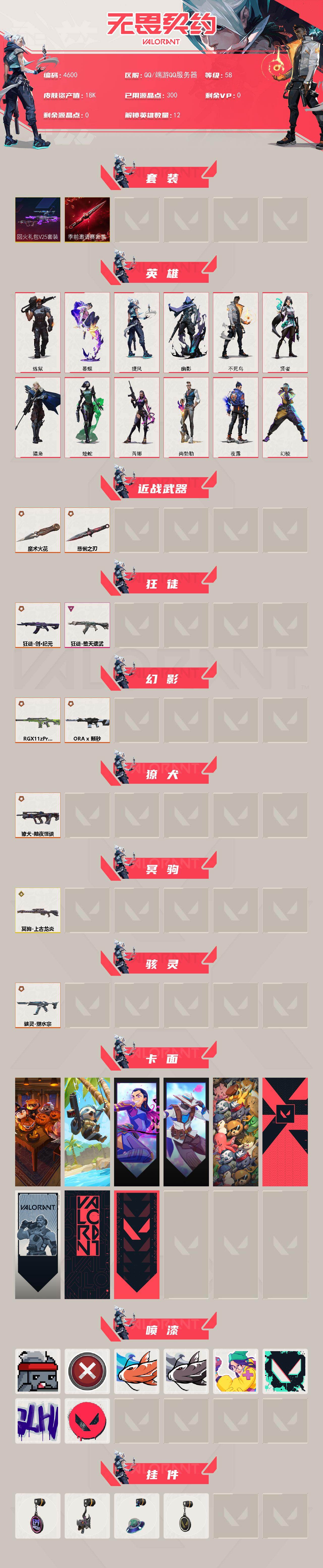 终极*7/传奇*2/卓越*1/皮肤*21/等级*58/段位:白银/无畏契约季前邀请赛套装/回火礼包// V25套装/幻棱/炼狱/暮蝶/捷风/幽影/不死鸟/贤者/猎枭/蝰蛇/芮娜/尚勃勒/夜露/近战武器-无畏契约季前邀请赛 悲悯之刃/近战武器-魔术火花/创·纪元 狂徒/狂徒-堕天遗武/RGX 11z Pro//2.0 幻影/幻影-ORA x 颗秒/獠犬-黯夜怪谈/上古龙炎 冥驹/骇灵-塑水宗/南
