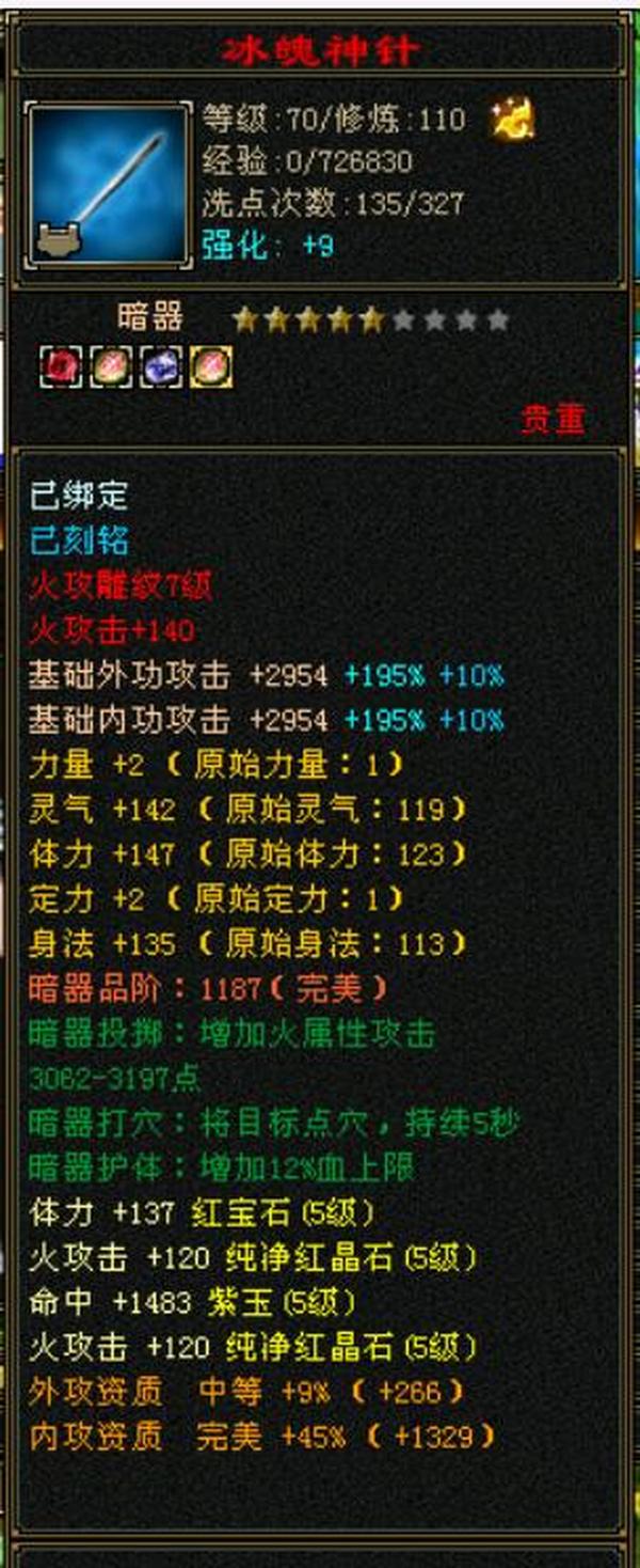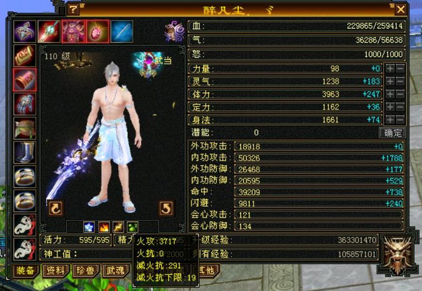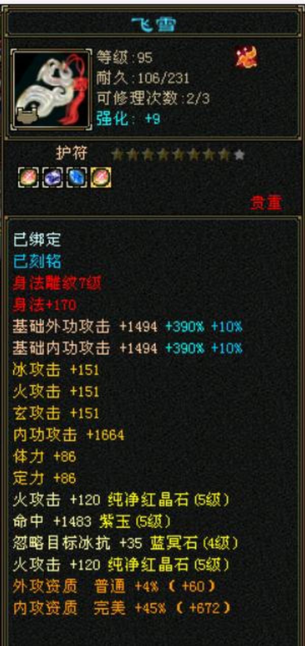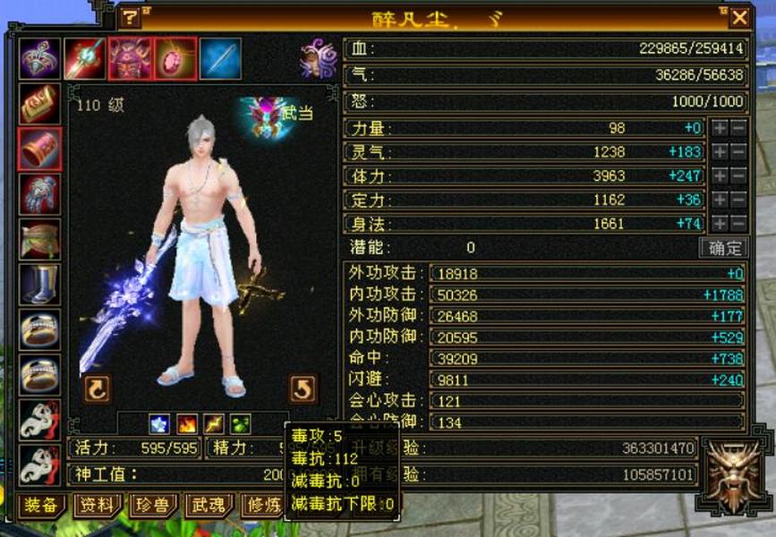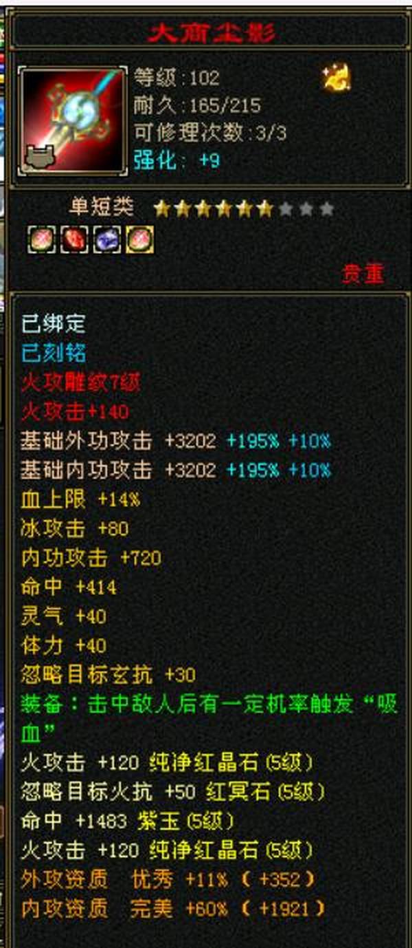 细节五级火武当 三修主属性3700 副属性1800 896大完美武魂下限19 内功五万没有一个猫眼 25万血,7雕文,心法除最后一本全一百修炼差点,坐骑雪猿,时装大裤衩5周年庆朔光 断桥残雪长庚仓库有宝石,带个谨慎猴子。平推怪5.7-6.5打人1-1.3裸面板无任何精华药 全是比较细了