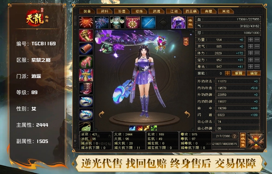 【TGC81169】 | 逍遥 | 等级:89 | 主属性:2444 | 副属性:1505 | 女 | 主火攻