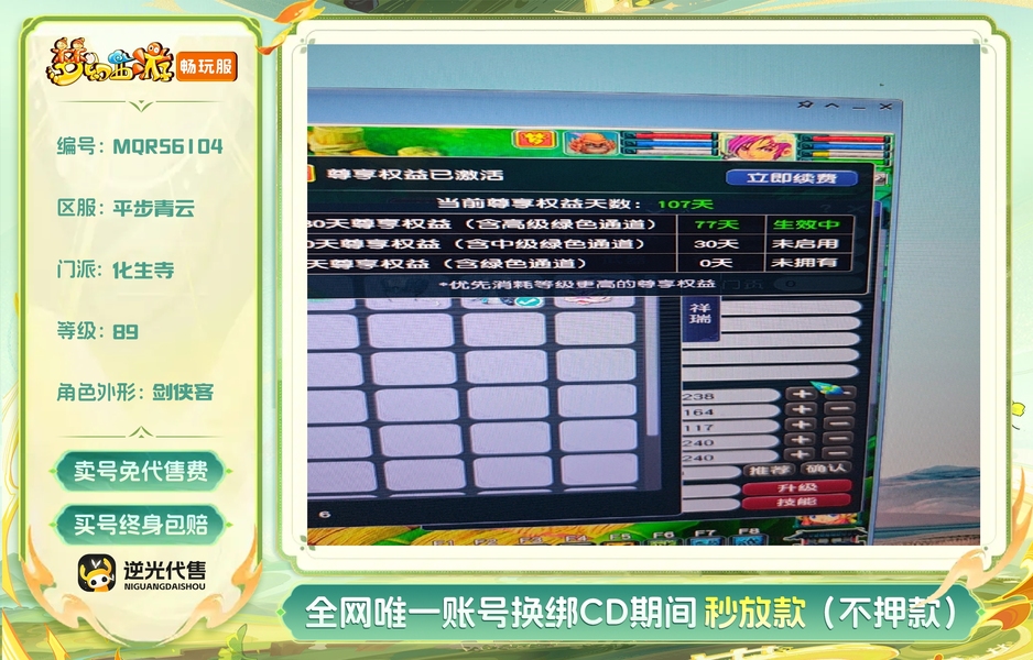 1和尚4盘丝540绿通还都有73天,带80级4段装备5个巡游,血敏凤凰1,3修7-带8级法宝葫芦,试炼石5个。上手即玩