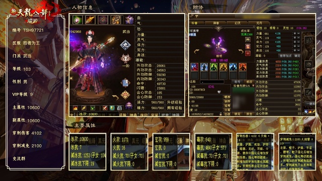 武当 | 等级:103 | 主属性:10600 | 男 | 评分:342 | 副属性:2770 | 穿刺伤害:4102 | 穿刺减免:2100 | VIP9 | 【买号找回永久包赔】