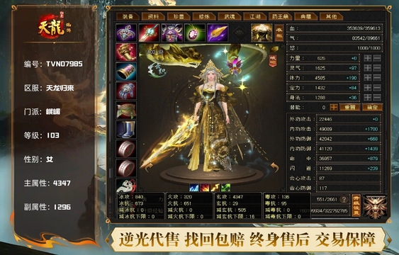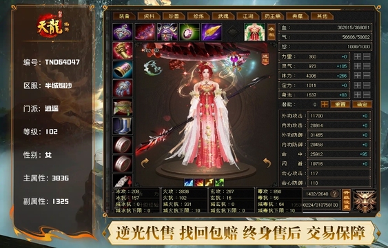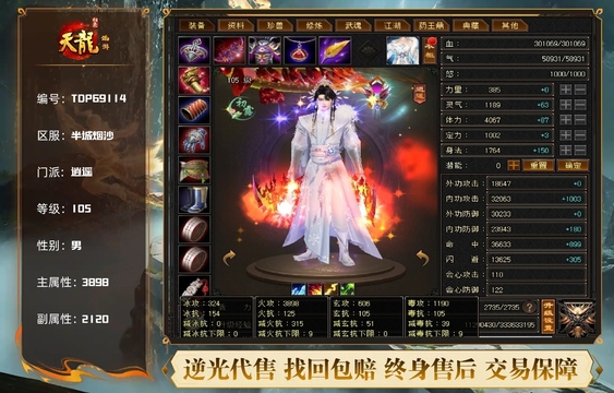 装备满孔,5体5属4减抗,7级雕文,主属性3836,副属性1325,成品双10附体游龙,成品PK宝宝,开暗器附体36万血,完美暗器,武魂,带3100金,多套时装。没时间玩了,有意向的可以来聊聊
