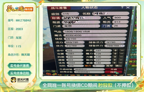 总经验:60000万 | 等级:115 | 龙宫 | 无换绑CD | 30天尊享特权 | 女 | 【逆光代售卖号0手续费】【买号找回永久包赔】