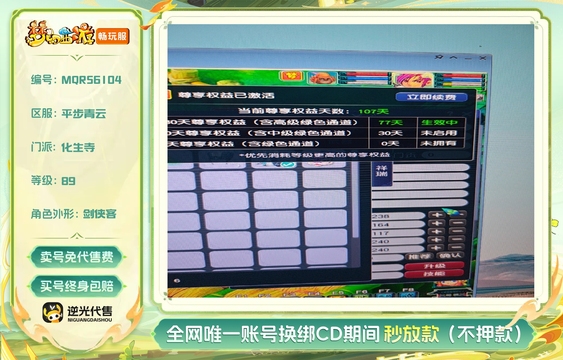 总经验:20000万 | 等级:89 | 盘丝洞,化生寺 | 无换绑CD | 180天尊享特权 | 男 | 【逆光代售卖号0手续费】【买号找回永久包赔】