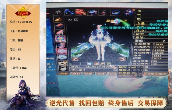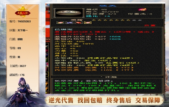 89卡级暴力细节5544天山,心法修炼全满,9矿9药4盟会,生活打架都可以。