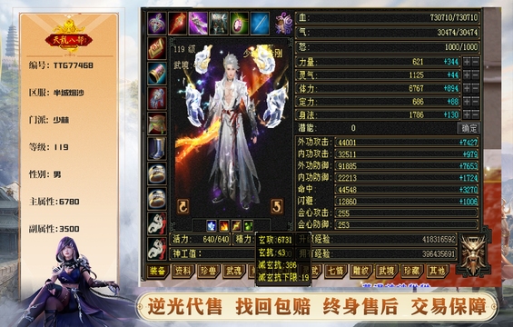 少林 | 等级:119 | 主属性:6780 | 副属性:3500 | 男 | 主玄攻 | VIP6 | 畅游账号