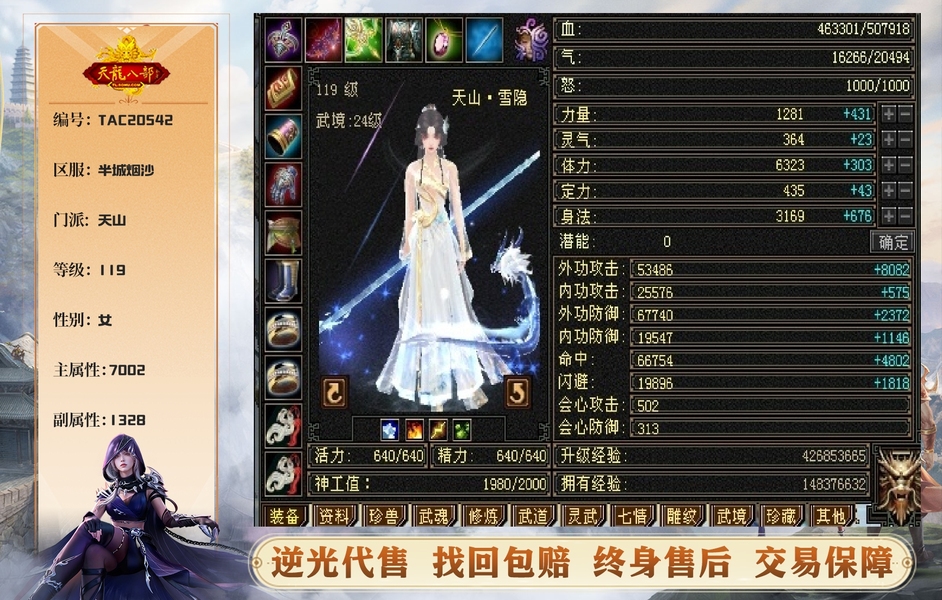 【TAC20542】 | 天山 | 等级:119 | 主属性:7002 | 副属性:1328 | 女 | 主冰攻 | VIP3 | 畅游账号