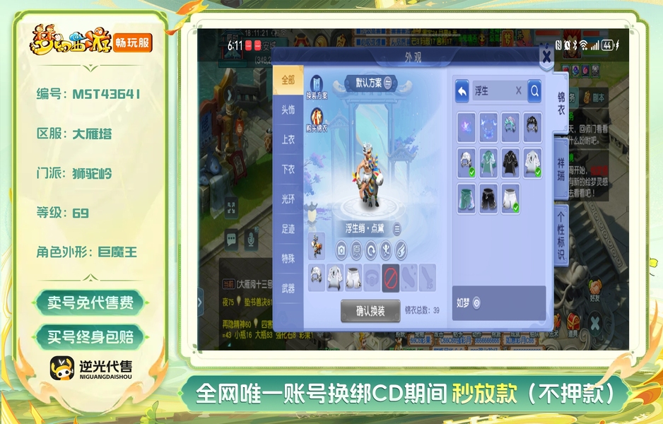 4位id,3套浮生光膀子,满修满强身。简单装备任务够用,拿过状元