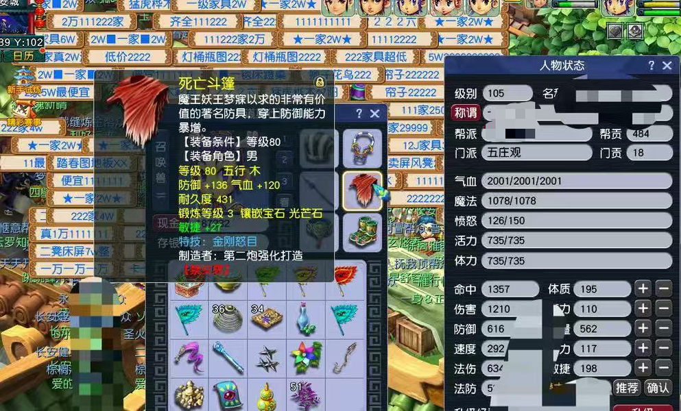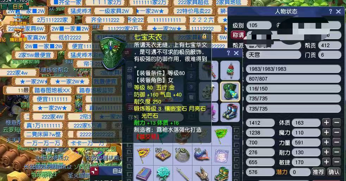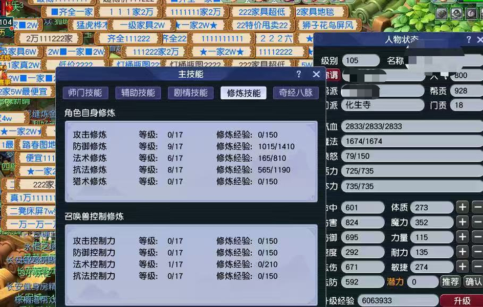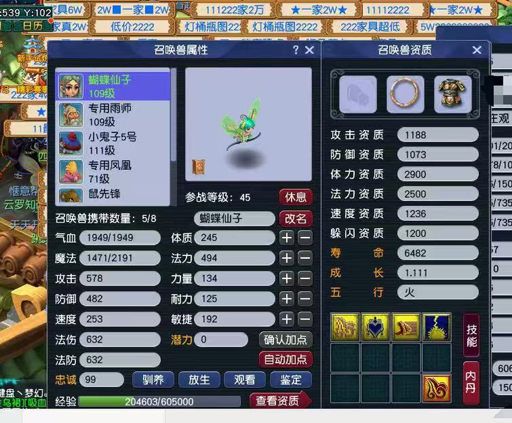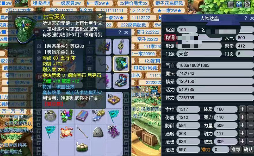 一化生俩五庄俩天宫 化生有天阵 全身3段未打附魔属性 物理都有八层风带 一组蝴蝶 四个鬼子 队长有个紫气豪宅满环境度 买的810礼包弄的家具 不缺寿命 703打BY妖无压力