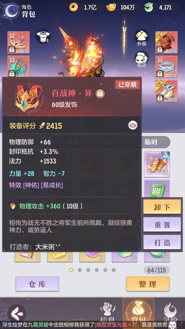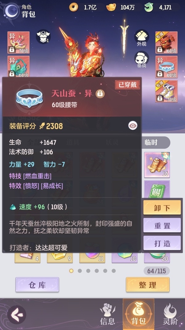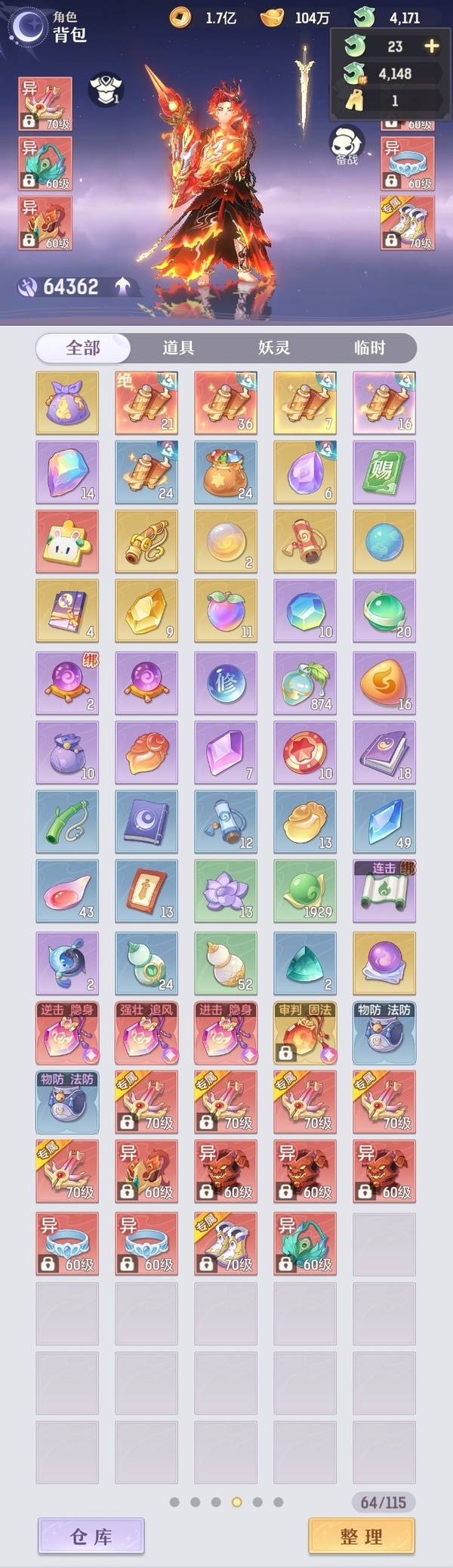 颜值:18726 | 等级:69 | 唐门 | 神兽数:9 | 法宝颜色统计:10红0蓝 | 总评分:300309 | 角色评分:64362 | 妖灵评分:169183 | 灵师评分:66764 | 倾天四 | 离火苍龙,九春韶华,火树银花,乘波踏浪,山君现,哈?我当武器?,清寒羽冽,碎梦语情,灵鸢一梦,一刹雷鸣,墨染尘烟,星河揽月 | 火神·赤曦 | 乌蹄·照夜,祥云,太一驴,钱多多,气球派对,灵华引,星昀渡,比翼同舆,万海真君,罗帷七香车,飞起来·壹号,负山海,北域霜枭,跃龙门,鸭与云游,飞天笔,飞龙在天,红莲·出尘,兔球,大荒之主,焚天火凤,花将军,招财进喵,初弦瑶桂,乘风入梦,狐心入梦,风驰电掣,踏火焚夜 | 【买号找回永久包赔】