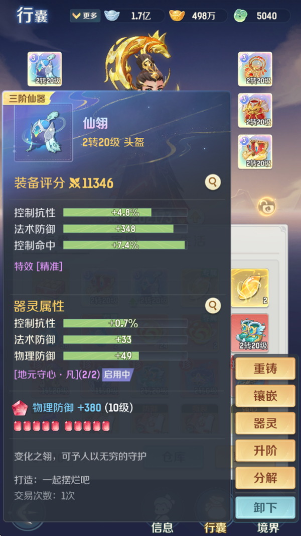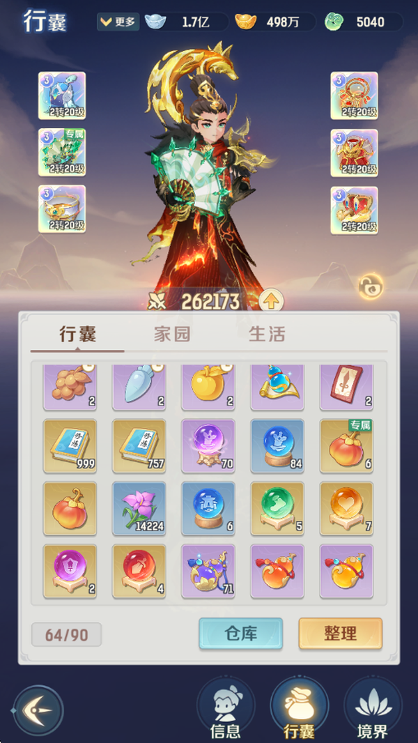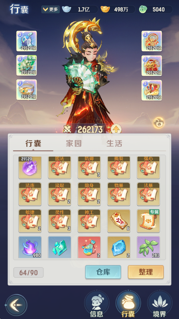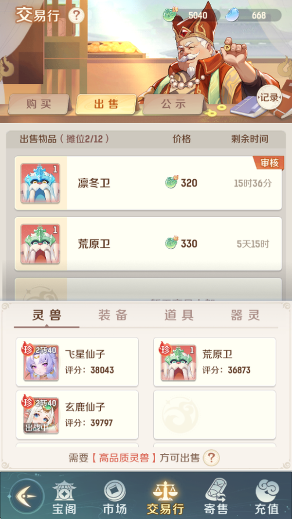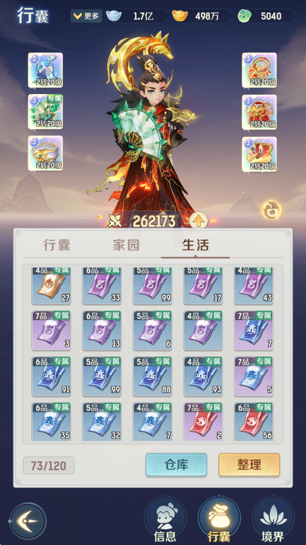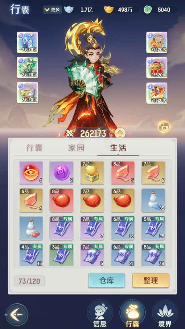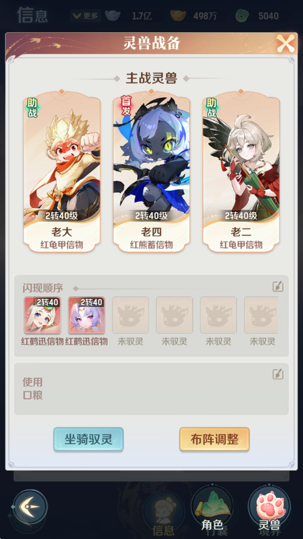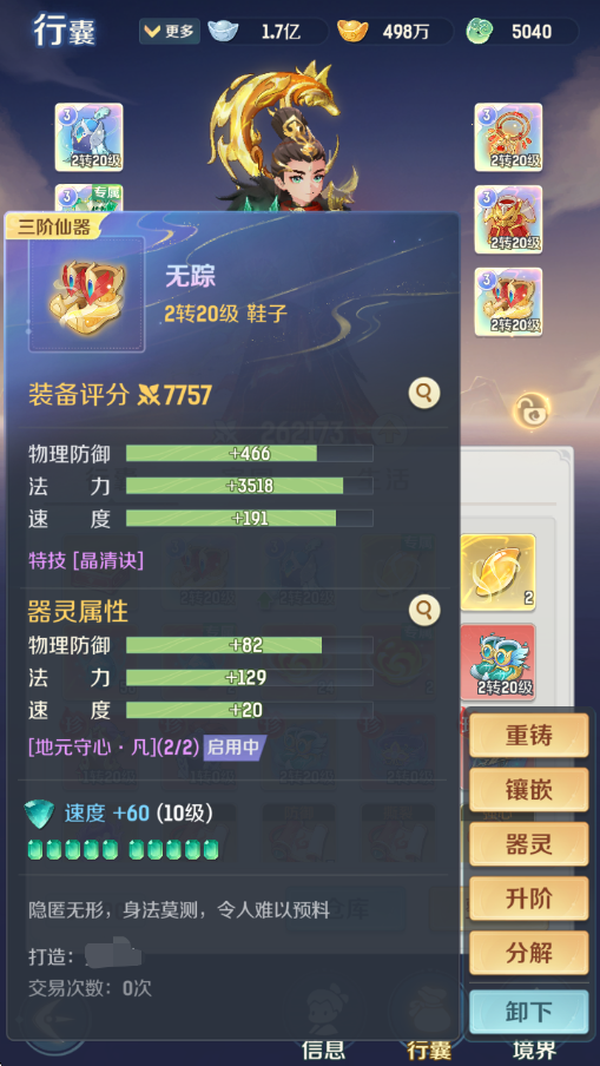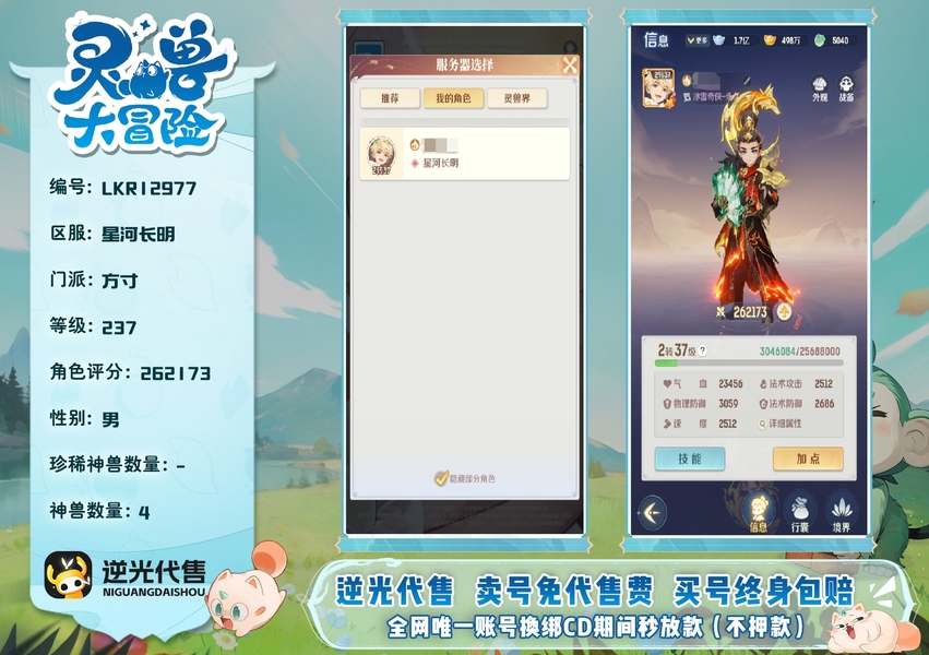 - 资源:有500万元宝 背包(高级书、宝石、八荒、神兽丹)可以卖近200万元宝 - 神兽:4只进阶+觉醒(猴子/精卫/画中仙/狰) 心法命中特效,有固定队可以直接跟队。 - 装备:8件3阶仙器 特技:晶清+罗汉+群盾 特效:愤怒+迅捷+匠心+命中精准