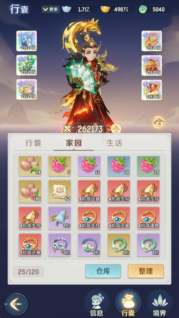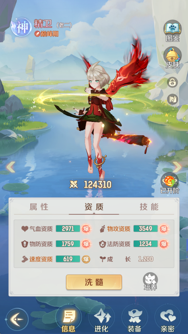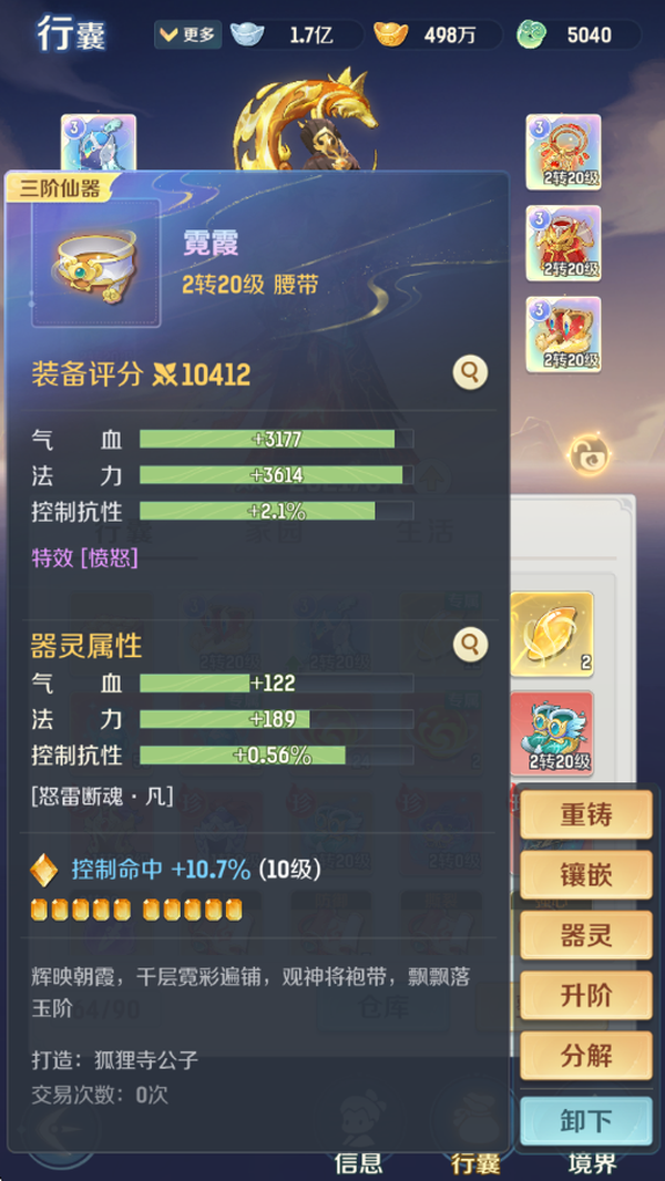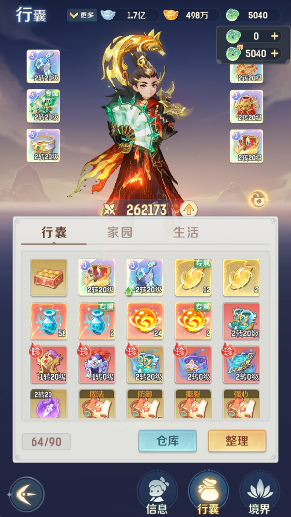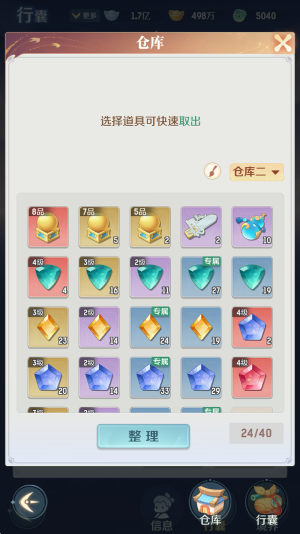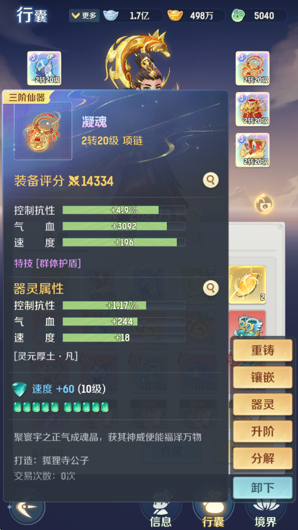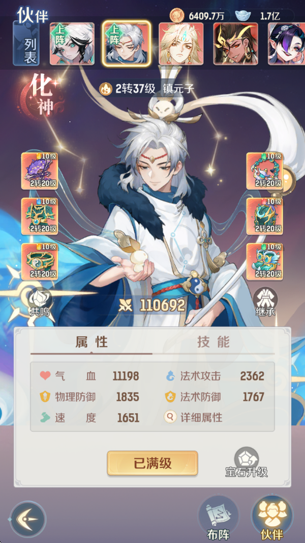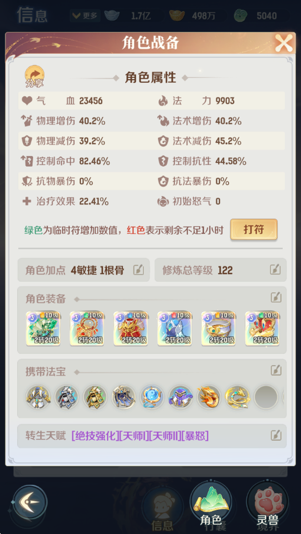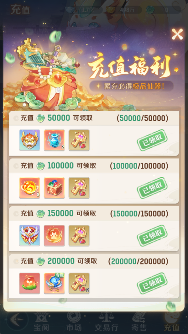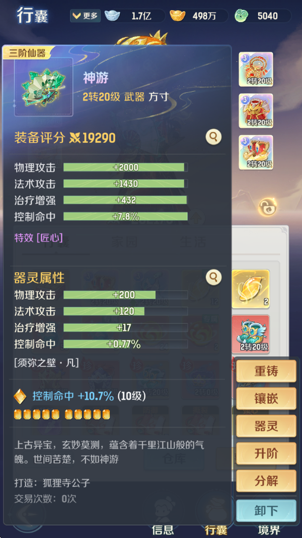 - 资源:有500万元宝 背包(高级书、宝石、八荒、神兽丹)可以卖近200万元宝 - 神兽:4只进阶+觉醒(猴子/精卫/画中仙/狰) 心法命中特效,有固定队可以直接跟队。 - 装备:8件3阶仙器 特技:晶清+罗汉+群盾 特效:愤怒+迅捷+匠心+命中精准