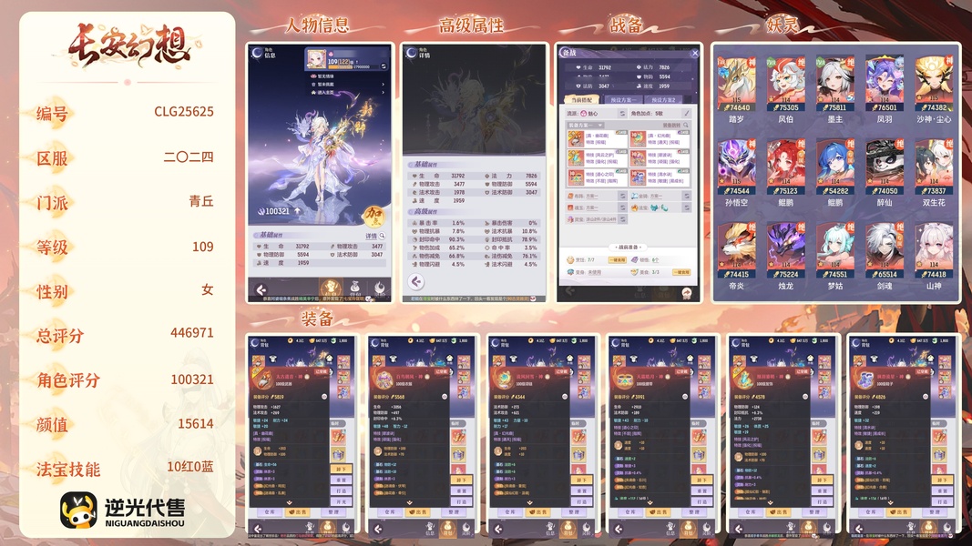 【CLG25625】 | 颜值:15614 | 等级:109 | 青丘 | 神兽数:3 | 法宝颜色统计:10红0蓝 | 总评分:446971 | 角色评分:100321 | 妖灵评分:225756 | 灵师评分:120894 | 倾天三 | 离火苍龙,九春韶华,织梦星海,山君现,哈?我当武器?,清寒羽冽,一刹雷鸣,墨染尘烟 | 蝶恋芳菲 | 乌蹄·照夜,太一驴,大荒之主,海月璃梦,蟹有钳,钱多多,气球派对,星昀渡,万海真君,焚天火凤,花将军,蕴灵天剑,招财进喵,初弦瑶桂,血蚀苍牙,鼠鼠·星愿巫,北域霜枭,风驰电掣,凤蝶·梦浮生,跃龙门 | 【买号找回永久包赔】