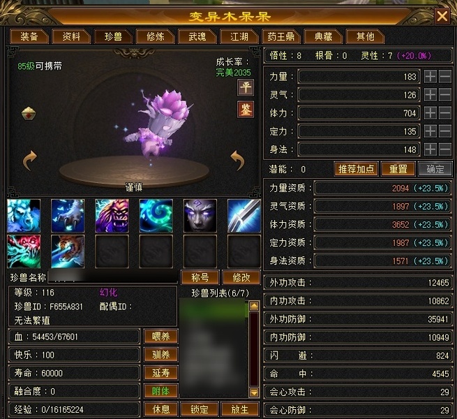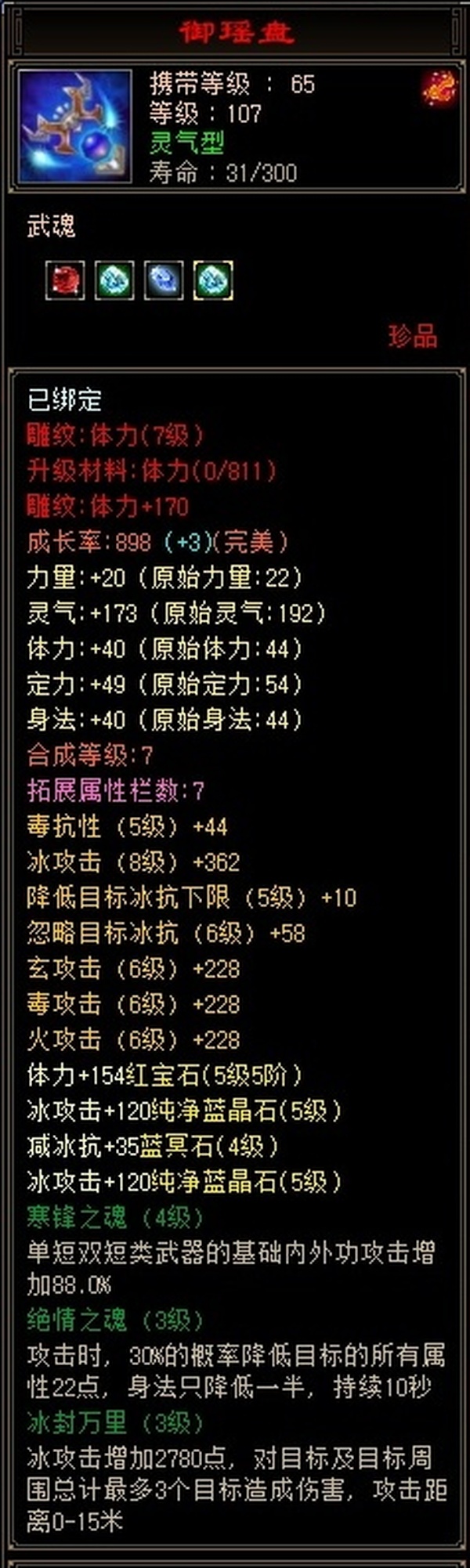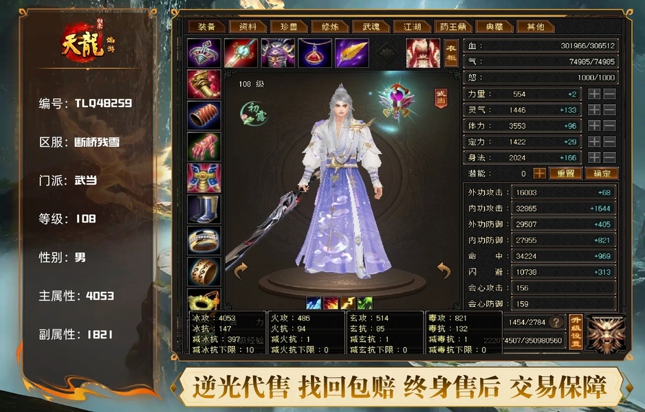 108武当,5带6石头,裸属性4053,副属性1800+无附体,带附体4300属左右,901大完美武魂,共计消费3w多,英雄帖全买,活动一期不差
