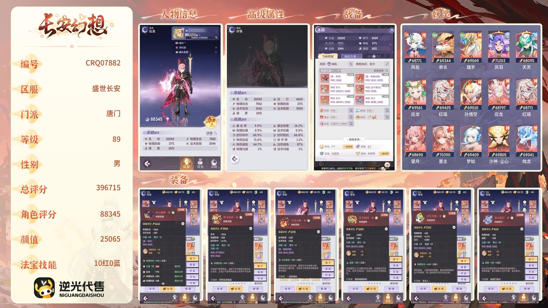 【CRQ07882】 | 颜值:25065 | 等级:89 | 唐门 | 神兽数:8 | 法宝颜色统计:10红0蓝 | 总评分:396715 | 角色评分:88345 | 妖灵评分:207184 | 灵师评分:101186 | 倾天三 | 淬金曜蚀,织梦星海,乘波踏浪,山君现,清寒羽冽,灵鸢一梦,墨染尘烟,星河揽月,离火苍龙,九春韶华,玉兔月赏,火树银花,哈?我当武器?,碎梦语情,炙烤大串,一刹雷鸣 | 蝶恋芳菲,火神·赤曦 | 乌蹄·照夜,祥云,嘟嘟雪橇,蟹有钳,钱多多,气球派对,灵华引,星昀渡,比翼同舆,万海真君,蕴灵天剑,云心漫游,浪起来,飞起来·壹号,负山海,北域霜枭,跃龙门,鸭与云游,喵小萌,马上到,飞龙在天,红莲·出尘,兔球,风火乾坤,大荒之主,海月璃梦,贯日神君,星火·黑炎,焚天火凤,灵刃幼狼,花将军,招财进喵,初弦瑶桂,乘风入梦,鼠鼠·星愿巫,狐心入梦,风驰电掣,踏火焚夜,凤蝶·梦浮生,逍遥羊 | 【买号找回永久包赔】