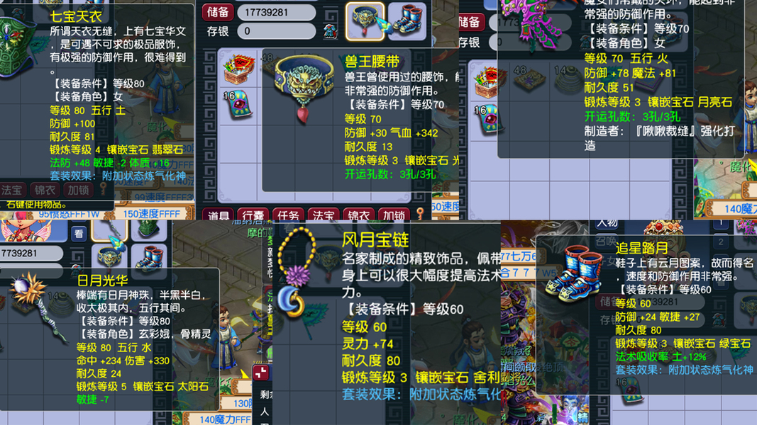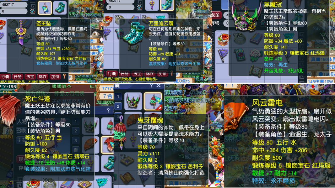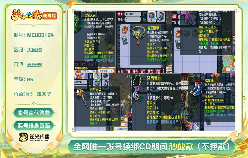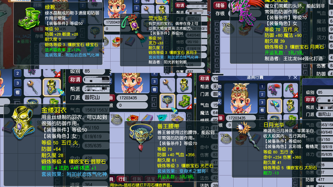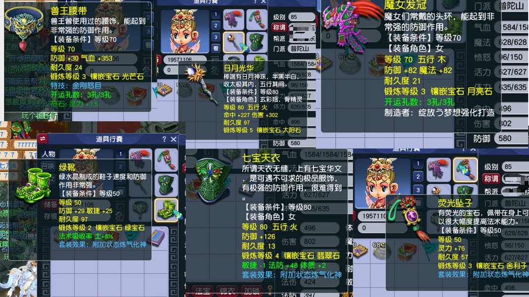 1、成品1五庄4普陀 2、85级2组,109级1组(打包可以适当优惠) 3、储备经验4-8E 4、储备金都有几千万 5、修炼都是10-13修,帮派不封资材,随时可以点到人修满 6、每个号都有紫气豪宅1套、烹饪双倍、宝宝寿命用不完 7、每个号配成品变异芙蓉、109是成品便宜吸血鬼+全20伤宝宝装 8、每个号都是炼气化神套、五庄不磨武器 9、法宝、3孔装备都已齐全! 10、师门技能全满、生活技能都有! 11、通刷一切活动! 12、静等有缘人,客服可以联系到我,非诚勿扰!