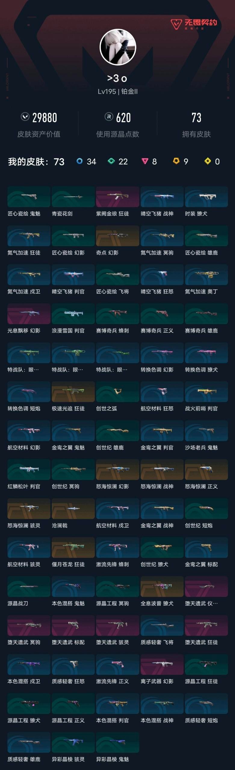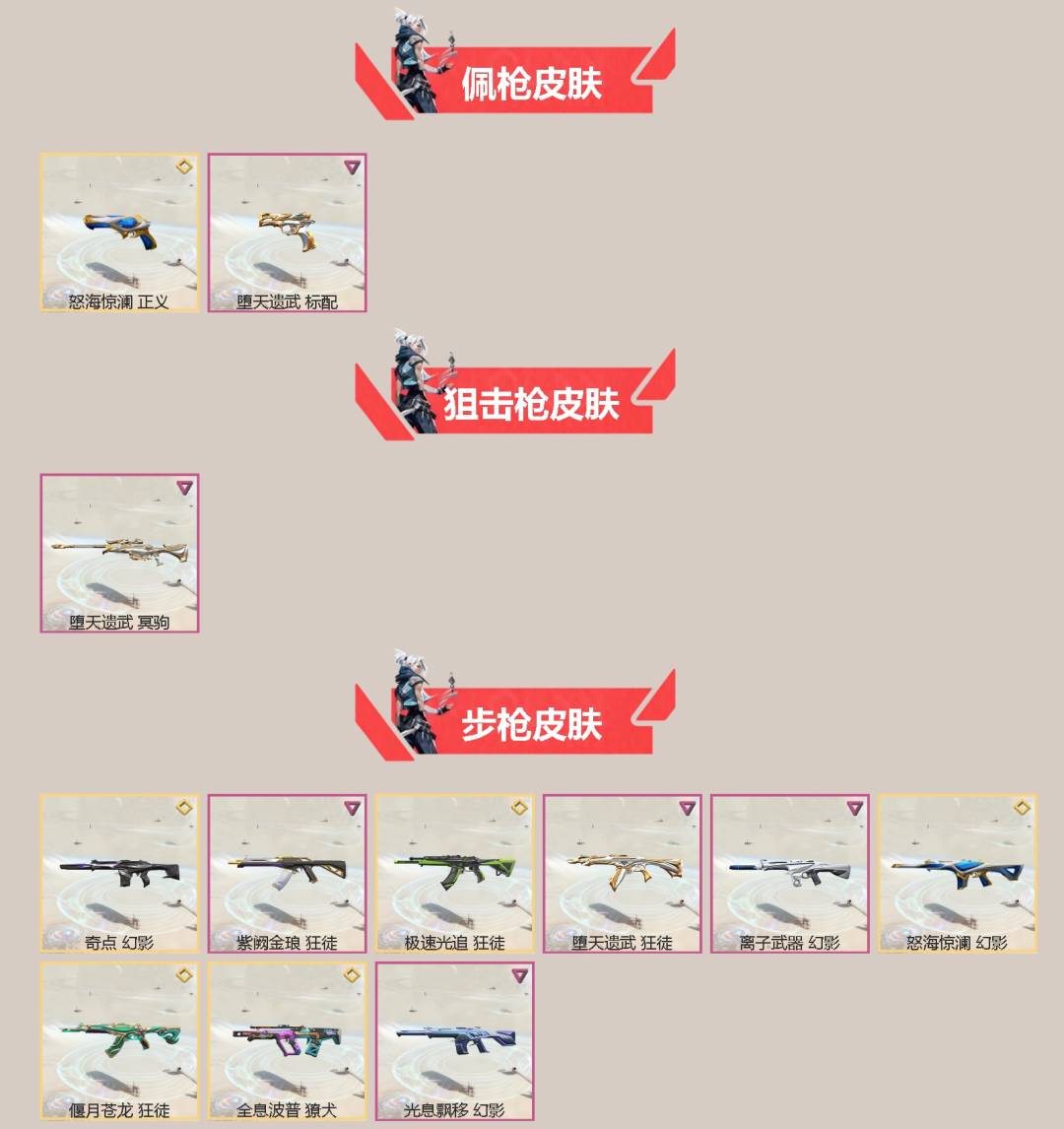 []9传奇 8卓越 铂金 不可二次 不可修改实名 【机枪皮肤】怒海惊澜 战神 【冲锋枪皮肤】怒海惊澜 骇灵,堕天遗武 骇灵 【近战武器皮肤】怒海惊澜 沧澜戟,堕天遗武 仪式匕首 【狙击枪皮肤】堕天遗武 冥驹 【佩枪皮肤】怒海惊澜 正义,堕天遗武 标配 【步枪皮肤】光息飘移 幻影,怒