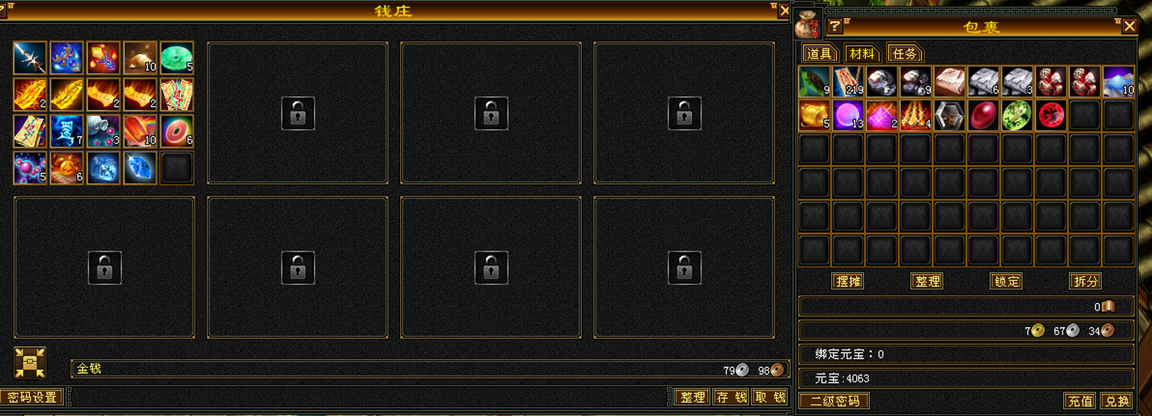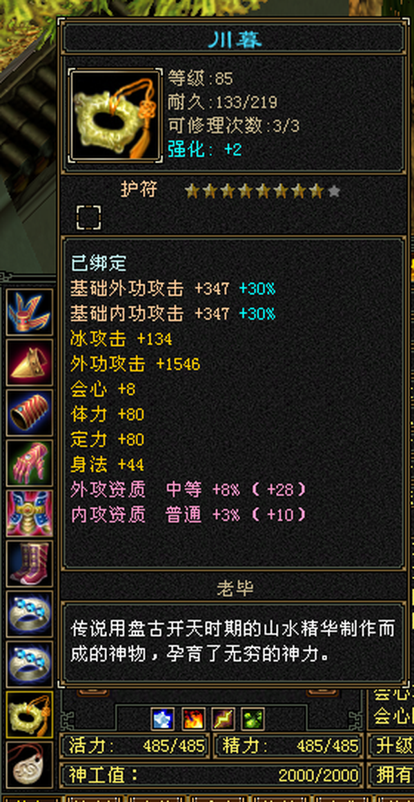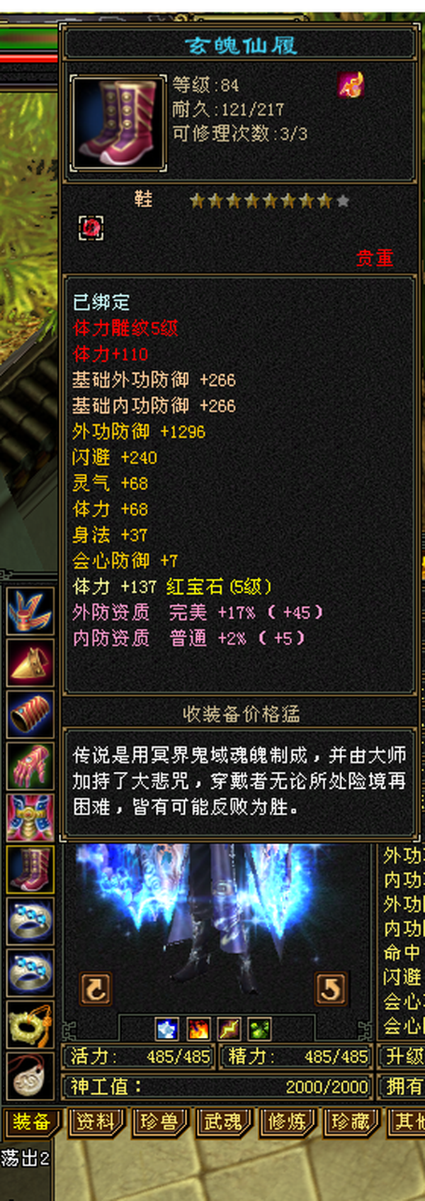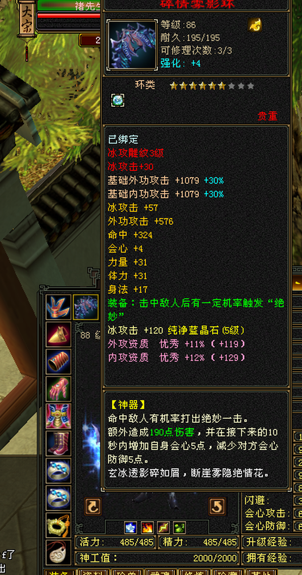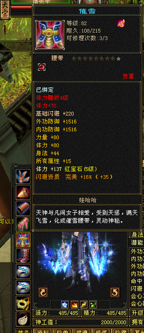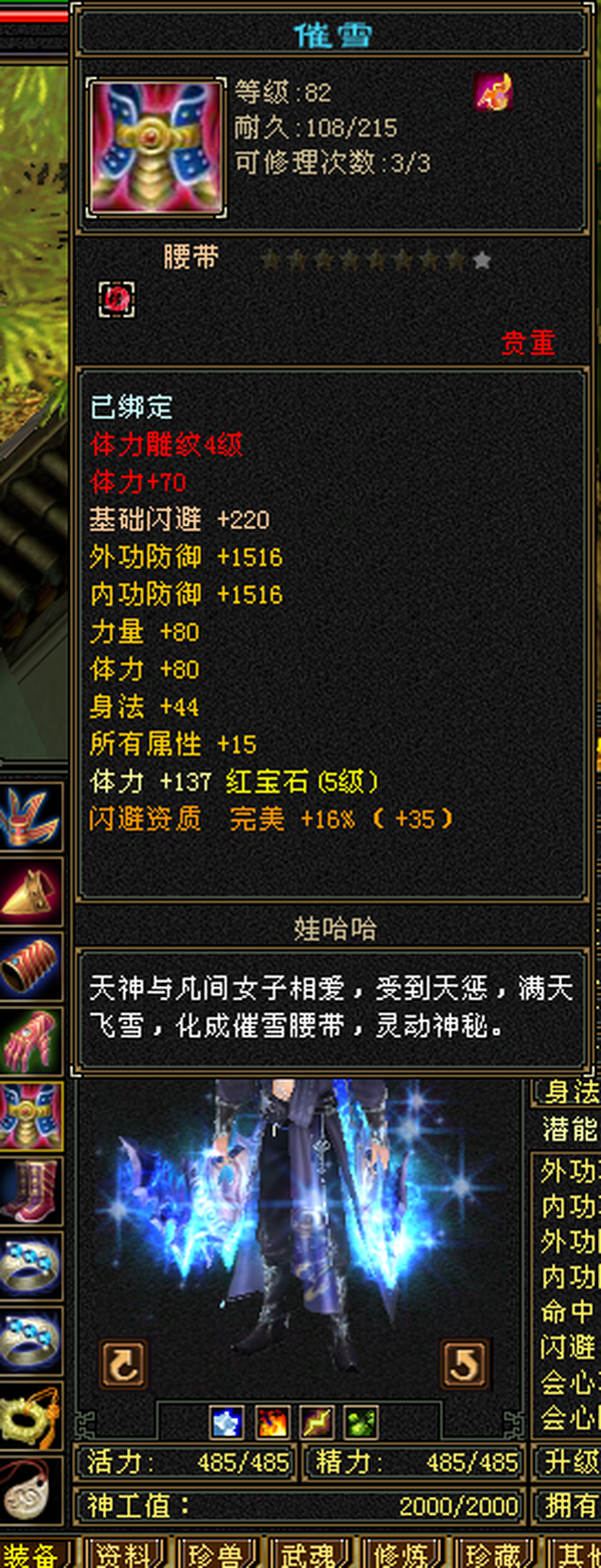 极品装备5级石头,仓库有减抗石头,包裹还有4千多元宝 天马 神器全部搞好,上线就是干