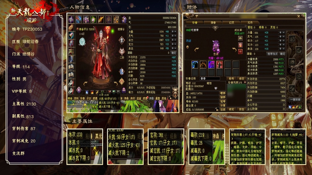 【TPZ30053】 | 绝情谷 | 等级:114 | 主属性:2130 | 男 | 评分:52830 | 副属性:813 | 穿刺伤害:87 | 穿刺减免:20 | VIP8 | 【买号找回永久包赔】