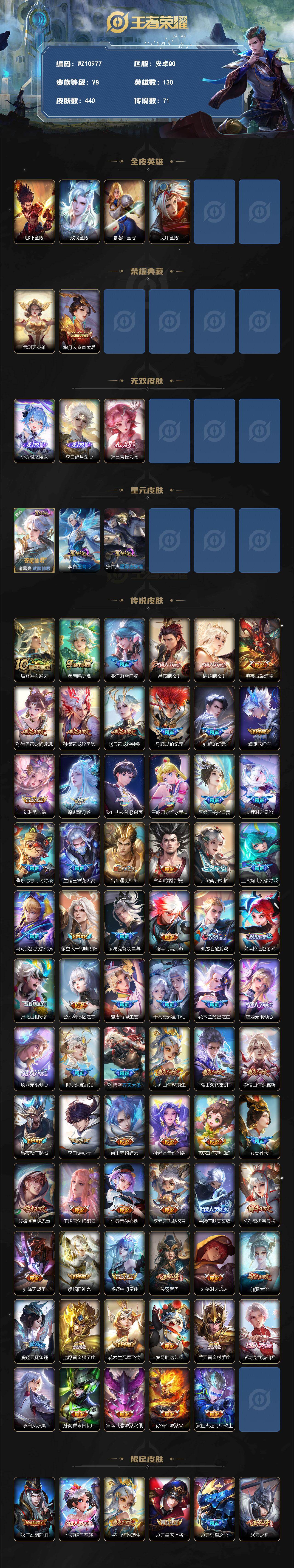 【WKD75125】 | 无防沉迷 | 可排位 | 贵族10级 | 倔强青铜 | 英雄数量:130 | 皮肤数量:440 | 马超琥珀纪元,鬼谷子天穹祈灯,艾琳觅芳踪,夏侯惇朔风刀,貂蝉曦玄引,吕布曦玄引,典韦蓝屏警告,后羿如梦令,猪八戒猪悟能,后羿辉光之辰,裴擒虎擒涛扼浪,孙悟空齐天大圣,王昭君凤凰于飞,小乔山海琳琅生,公孙离祈雪灵祝,韩信飞衡,王昭君永恒水手月亮,嫦娥拒霜思,扁鹊奇幻香踪,赵云皇家上将,蒙犽百解令,墨子神迹守卫,夏洛特浮生妄,高渐离燃音魔法,王昭君午后时光,沈梦溪龙舞盛年,孙策乘龙淬吴钩,项羽海滩派对,嬴政白昼王子,伽罗炽翼辉光,上官婉儿妄想奇谈,马可波罗妄想实况,沈梦溪匿光破解者,亚连落雪白狼,瑶山海碧波行,吕布御风骁将,干将莫邪胡桃夹子,弈星混沌棋,张飞百相守梦,杨玉环寅虎心曲,鲁班大师探海日志,虞姬启明星使,老夫子醍醐杖,西施至美乘鲤谣,钟馗驱傩正仪,铠琥珀纪元,芈月幻夜卜梦,甄姬幽恒,关羽武圣,妲己时之奇旅,诸葛亮鹤羽星尊,明世隐疑决卦,雅典娜单词大作战,鲁班七号蔬乡物语,李白凤求凰,马可波罗山海玄木吟,李元芳云中旅人,鲁班七号时之奇旅,诸葛亮武陵仙君,蔡文姬奇迹圣诞,张良古海寻踪,貂蝉逐梦之音,程咬金演武夺筹,牛魔奔雷神使,曜山海苍雷引,司空震地狱燃心,伽罗太华,安琪拉乘龙聚宝船,杨戬潮玩骑兵,花木兰燃星之曲,赵云引擎之心,芈月白晶晶,张飞虎魄,孙悟空孙行者,孙膑天狼运算者,妲己灵卜魔法,虞姬无限倾心,甄姬至美化雀舞,吕布遇见神鼓,沈梦溪大漠名商,蒙犽狂想玩偶喵,庄周玄嵩,公孙离玉兔公主,鬼谷子原初探秘者,甄姬落雪兰心,甄姬游园惊梦,妲己热情桑巴,裴擒虎寅虎赤拳,狄仁杰魔术师,兰陵王默契交锋,孙悟空美猴王,元歌无心,小乔纯白花嫁,戈娅驭风魔法,孙悟空至尊宝,甄姬女儿国国王,西施玲珑珍味,哪吒逐梦之翼,刘邦剑破天穹,项羽无限倾心,大乔乘龙忆丹青,曹操天狼征服者,赵怀真鹤归松栖,黄忠烈魂,钟无艳超时空战士,典韦岱宗,云缨鹤归松栖,赵云乘龙铭钟鼎,亚瑟追逃游戏,周瑜雪夜绮愿,女娲补天,桑启海盐诗旅,小乔时之魔女,云中君纤云弄巧,孙尚香乘龙问璇玑,狄仁杰夜礼服假面,盾山御銮,李信山海炽霜斩,老夫子航海奇遇记,嫦娥如梦令,安琪拉追逃游戏,阿古朵江河有灵,公孙离蜜橘之夏,鬼谷子五谷丰年,干将莫邪画中仙,李白碎月剑心,狄仁杰万华元夜,嫦娥暖冬兔眠,大乔时之奇旅,曹操夜都魔契,艾琳流音漫舞,庄周云端筑梦师,嬴政优雅恋人,狄仁杰阴阳师,墨子降魔,百里玄策超元猎域,暃星界游侠,蔡文姬繁星吟游,伽罗琥珀纪元 | 司马懿暗渊魔法,典韦蓝屏警告,后羿如梦令,猪八戒猪悟能,后羿辉光之辰,大乔白蛇,王昭君凤凰于飞,韩信飞衡,嫦娥拒霜思,扁鹊奇幻香踪,赵云皇家上将,蒙犽百解令,韩信白龙吟,杨戬天秀启明,高渐离燃音魔法,钟馗乐园奇幻夜,墨子金属风暴,孙尚香时之恋人,嬴政白昼王子,貂蝉圣诞恋歌,哪吒雪上飞焰,白起星夜王子,扁鹊灵蛊蚀心,沈梦溪匿光破解者,妲己魅力维加斯,瑶山海碧波行,吕布御风骁将,嬴政暗夜贵公子,伽罗箭羽风息,杨玉环寅虎心曲,吕布末日机甲,西施至美乘鲤谣,夏侯惇乘风破浪,澜赏金猎手,嬴政摇滚巨星,沈梦溪月团寄思,廉颇地狱岩魂,甄姬幽恒,妲己时之奇旅,露娜紫霞仙子,李元芳逐浪之夏,鲁班七号蔬乡物语,马可波罗山海玄木吟,刘禅绅士熊喵,蔡文姬奇迹圣诞,程咬金功夫厨神,貂蝉逐梦之音,牛魔奔雷神使,孙尚香水果甜心,墨子龙骑士,艾琳奇遇舞章,刘邦德古拉伯爵,司空震地狱燃心,安琪拉乘龙聚宝船,赵云引擎之心,芈月白晶晶,张飞虎魄,项羽苍穹之光,孙悟空孙行者,孙膑天狼运算者,夏洛特永昼,亚瑟心灵战警,宫本武藏鬼剑武藏,蒙犽狂想玩偶喵,雅典娜冰冠公主,后羿石田雨龙,蒙犽龙鼓争鸣,庄周玄嵩,王昭君偶像歌手,公孙离玉兔公主,西施诗语江南,张飞乱世虎臣,狄仁杰鹰眼统帅,甄姬游园惊梦,妲己热情桑巴,狄仁杰魔术师,李白千年之狐,元歌无心,小乔纯白花嫁,戈娅驭风魔法,刘禅天才门将,公孙离无限星赏官,孙悟空至尊宝,甄姬女儿国国王,曹操幽灵船长,娜可露露晚萤,哪吒逐梦之翼,大乔乘龙忆丹青,曹操天狼征服者,橘右京修罗,赵怀真鹤归松栖,黄忠烈魂,钟无艳超时空战士,典韦岱宗,大乔猫狗日记,诸葛亮黄金分割率,小乔缤纷独角兽,赵云未来纪元,貂蝉唤灵魅影,妲己女仆咖啡,百里守约特工魅影,阿轲暗夜猫娘,兰陵王暗隐猎兽者,云中君纤云弄巧,铠曙光守护者,不知火舞魅语,安琪拉心灵骇客,老夫子航海奇遇记,嫦娥如梦令,吕布圣诞狂欢,阿古朵江河有灵,公孙离蜜橘之夏,鬼谷子五谷丰年,蔡文姬舞动绿茵,孙策猫狗日记,百里玄策热力回旋,花木兰水晶猎龙者,曹操夜都魔契,庄周云端筑梦师,嬴政优雅恋人,墨子降魔,百里玄策超元猎域,阿轲节奏热浪,鲁班七号电玩小子,暃星界游侠,甄姬冰雪圆舞曲,蔡文姬繁星吟游,伽罗琥珀纪元 | 马超琥珀纪元,貂蝉曦玄引,吕布曦玄引,虞姬无限倾心,甄姬至美化雀舞,吕布遇见神鼓,百里守约碎云,孙悟空地狱火,虞姬云霓雀翎,孙悟空齐天大圣,孙尚香末日机甲,小乔山海琳琅生,裴擒虎寅虎赤拳,公孙离祈雪灵祝,兰陵王默契交锋,王昭君永恒水手月亮,露娜霜月吟,达摩黄金狮子座,夏洛特浮生妄,宫本武藏惊梅引,孙尚香音你闪耀,后羿黄金射手座,孙策乘龙淬吴钩,伽罗炽翼辉光,项羽无限倾心,上官婉儿妄想奇谈,马可波罗妄想实况,亚连落