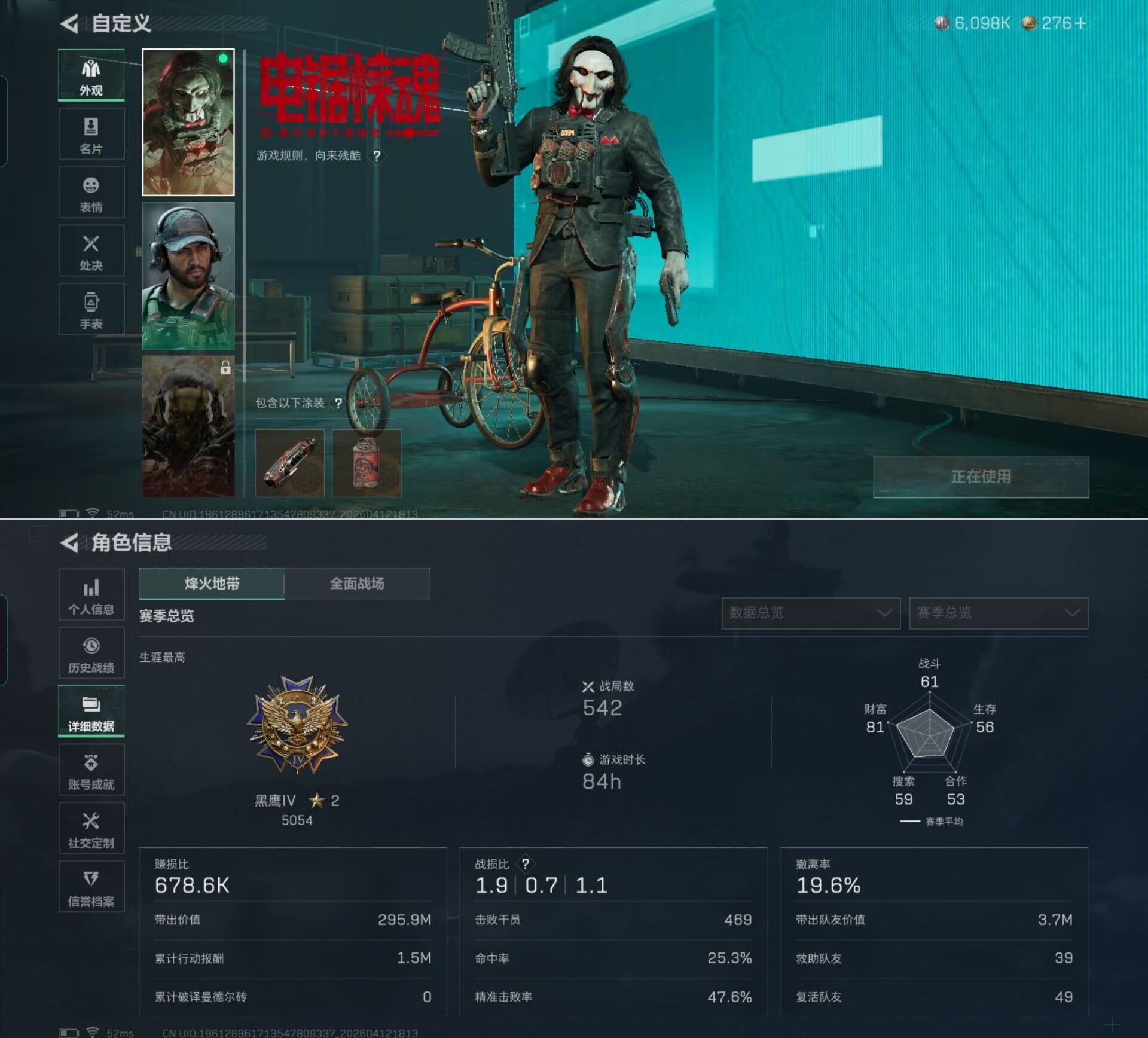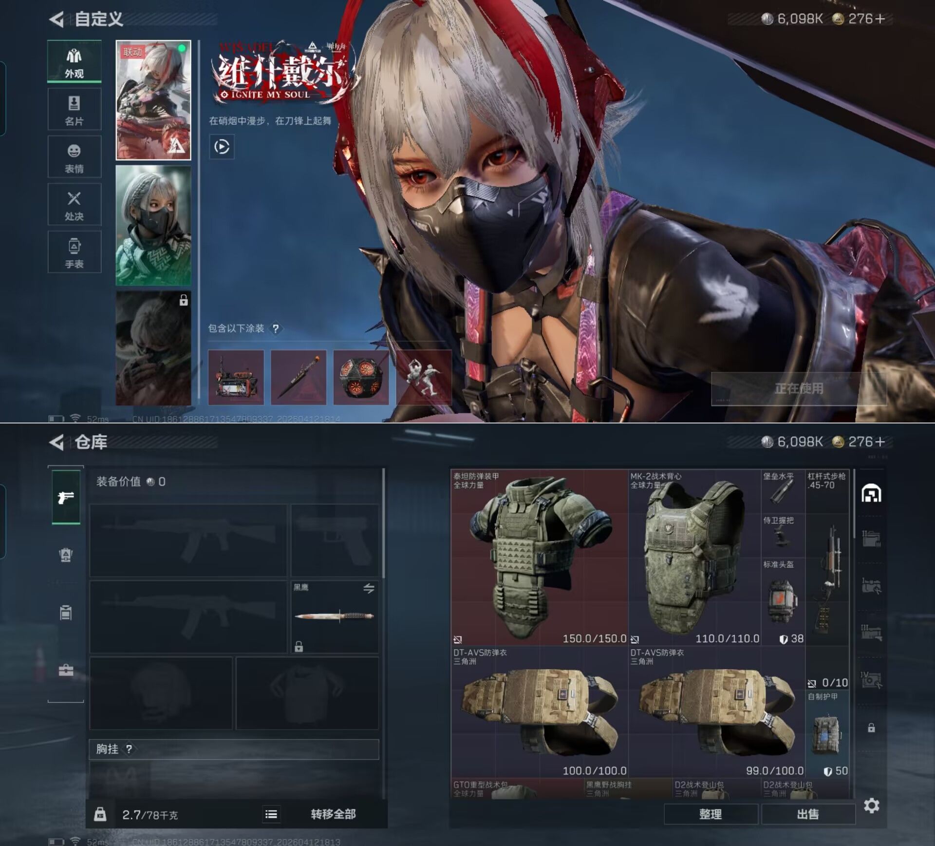 【4干员 红皮戴尔】【总资产(M)】30.09【哈夫币】6098k【行动等级】59【烽火地带段位】钻石【干员皮肤】 骇爪-维什戴尔 深蓝-不破誓约 露娜-金牌射手 红狼-电锯惊魂 【近战武器】 黑鹰 【枪皮】M4A1突击步枪-粉色涂装 M4A1突击步枪-高雅黑 M4A1突击步枪-海色 M4A1突击步枪-繁盛 AKM突击步枪-战术演练 AKM突击步枪-肃杀 QBZ95-1突击步枪