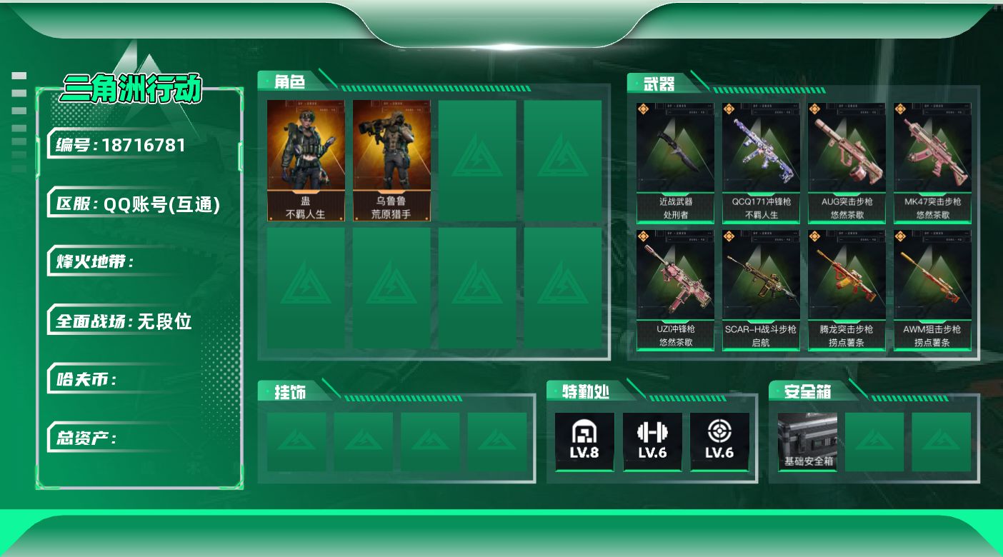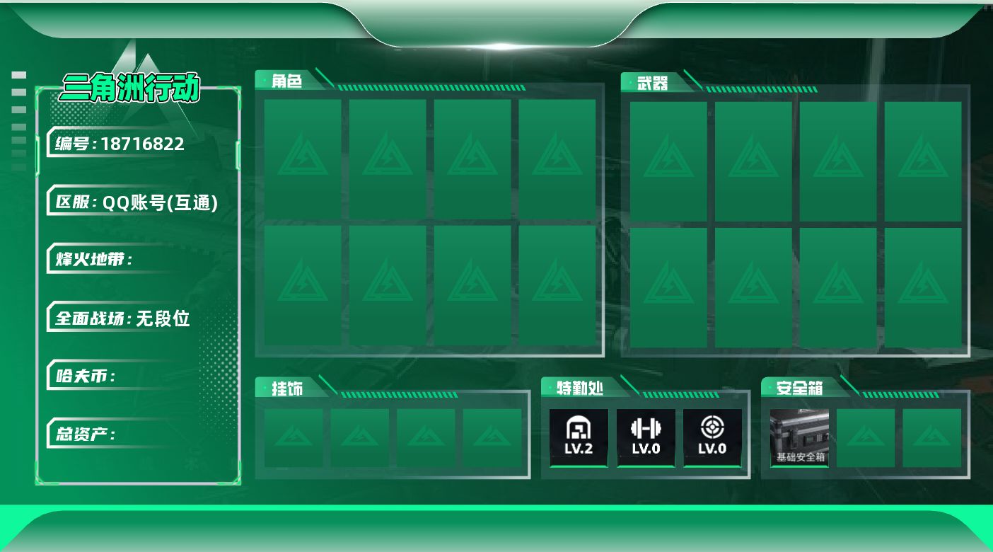 全面战场段位:列兵 | 烽火地带段位:钻石 | 战场等级:0 | 行动等级:60 | 通行证等级:0 | 总资产:6M | 现有哈夫币:0W | 黑鹰