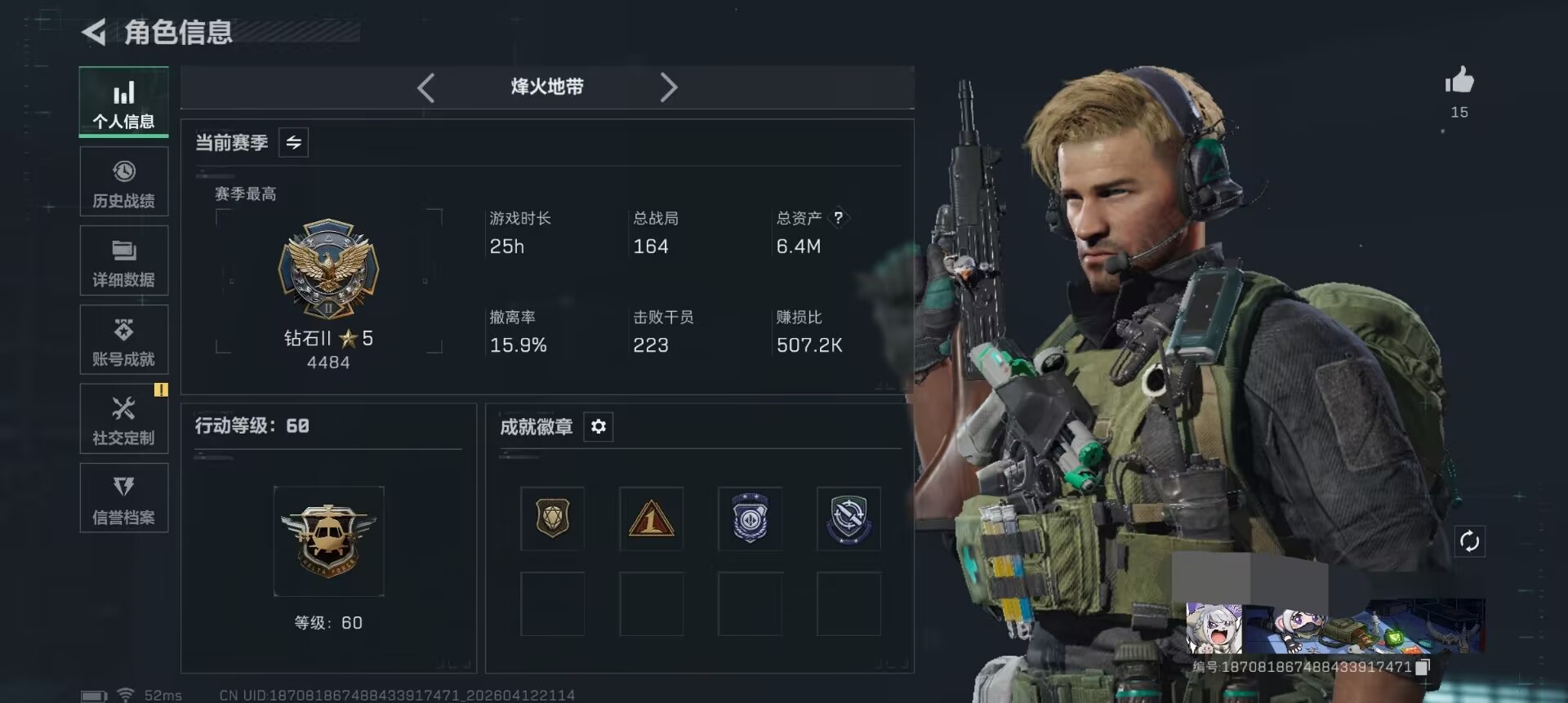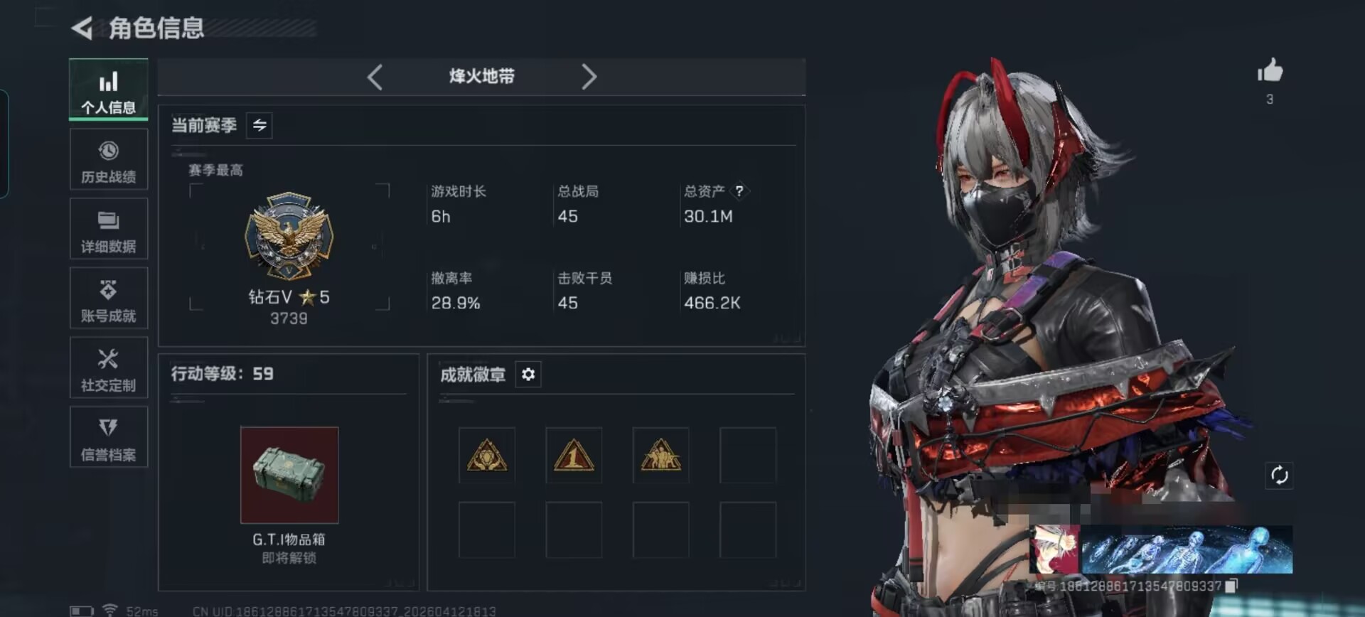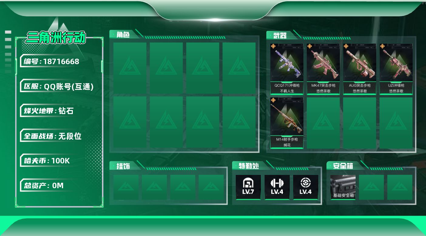 烽火地带段位:钻石 | 战场等级:0 | 行动等级:60 | 总资产:190M | 现有哈夫币:100000W