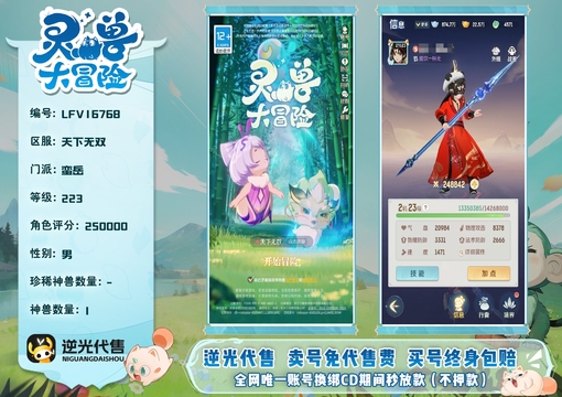 【LFV16768】 | 仙器:6 | 神兽数量:1 | 角色评分:250000 | 珍兽数量:2 | 等级:223 | 蛮岳 | 男 | 孙悟空 | 貔貅,龙马