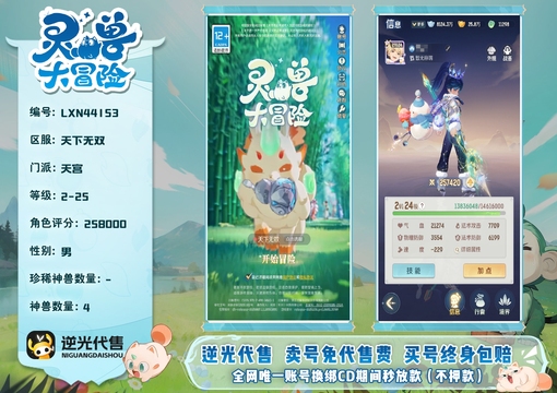 【LXN44153】 | 仙器:6 | 神兽数量:4 | 角色评分:258000 | 珍兽数量:2 | 等级:2-25 | 天宫 | 男 | 精卫,画中仙 | 貔貅,龙马