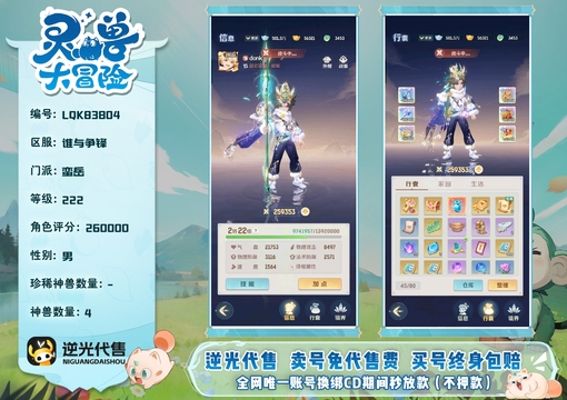 【LQK83804】 | 仙器:6 | 神兽数量:4 | 角色评分:260000 | 珍兽数量:2 | 等级:222 | 男 | 蛮岳 | 精卫,画中仙,孙悟空 | 龙马