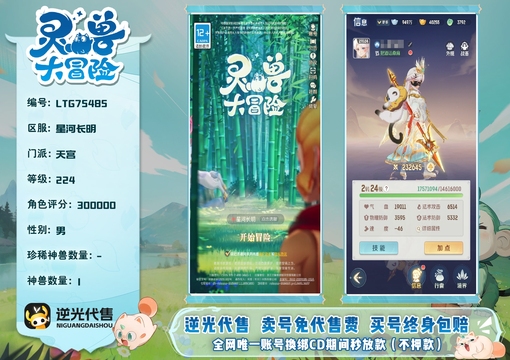 【LTG75485】 | 仙器:7 | 神兽数量:1 | 角色评分:300000 | 珍兽数量:2 | 等级:224 | 天宫 | 男 | 孙悟空 | 貔貅,龙马