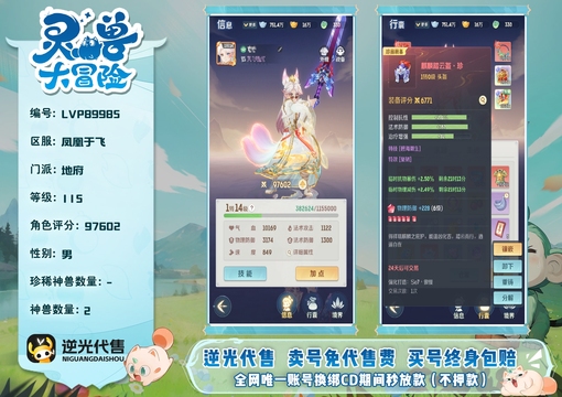 【LVP89985】 | 仙器:3 | 神兽数量:2 | 角色评分:97602 | 珍兽数量:3 | 等级:115 | 地府 | 男 | 画中仙 | 龙马