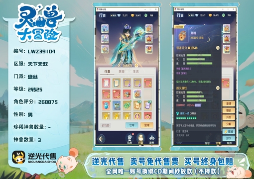 【LWZ39104】 | 仙器:6 | 神兽数量:3 | 角色评分:268875 | 珍兽数量:2 | 等级:2转25 | 盘丝 | 男 | 年,孔雀公主 | 画中仙,孙悟空 | 貔貅,龙马