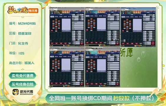 等级:105 | 盘丝洞,化生寺 | 无换绑CD | 30天尊享特权 | 女 | 【逆光代售卖号0手续费】【买号找回永久包赔】