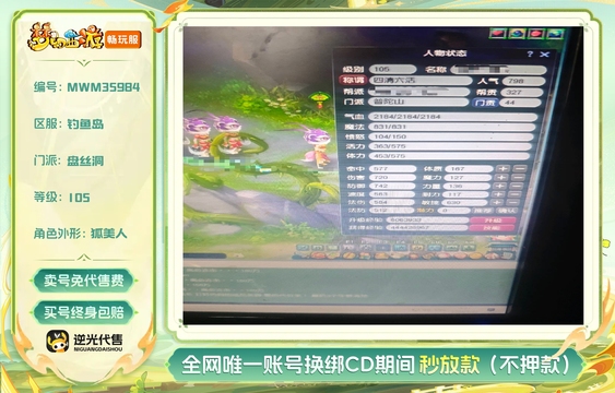 等级:105 | 盘丝洞,化生寺 | 无换绑CD | 30天尊享特权 | 女 | 【逆光代售卖号0手续费】【买号找回永久包赔】