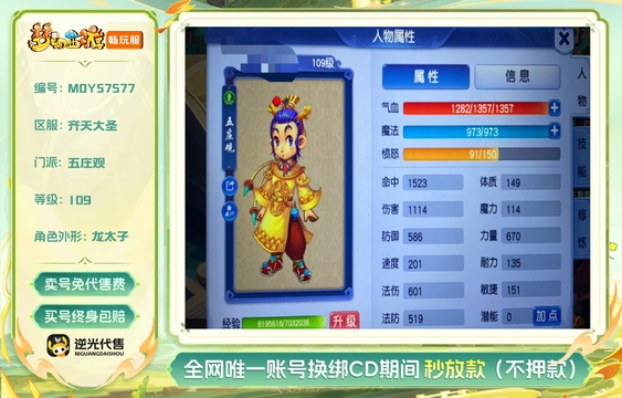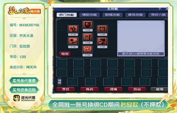 总经验:100000万 | 等级:109 | 五庄观 | 无换绑CD | 180天尊享特权 | 男 | 【逆光代售卖号0手续费】【买号找回永久包赔】
