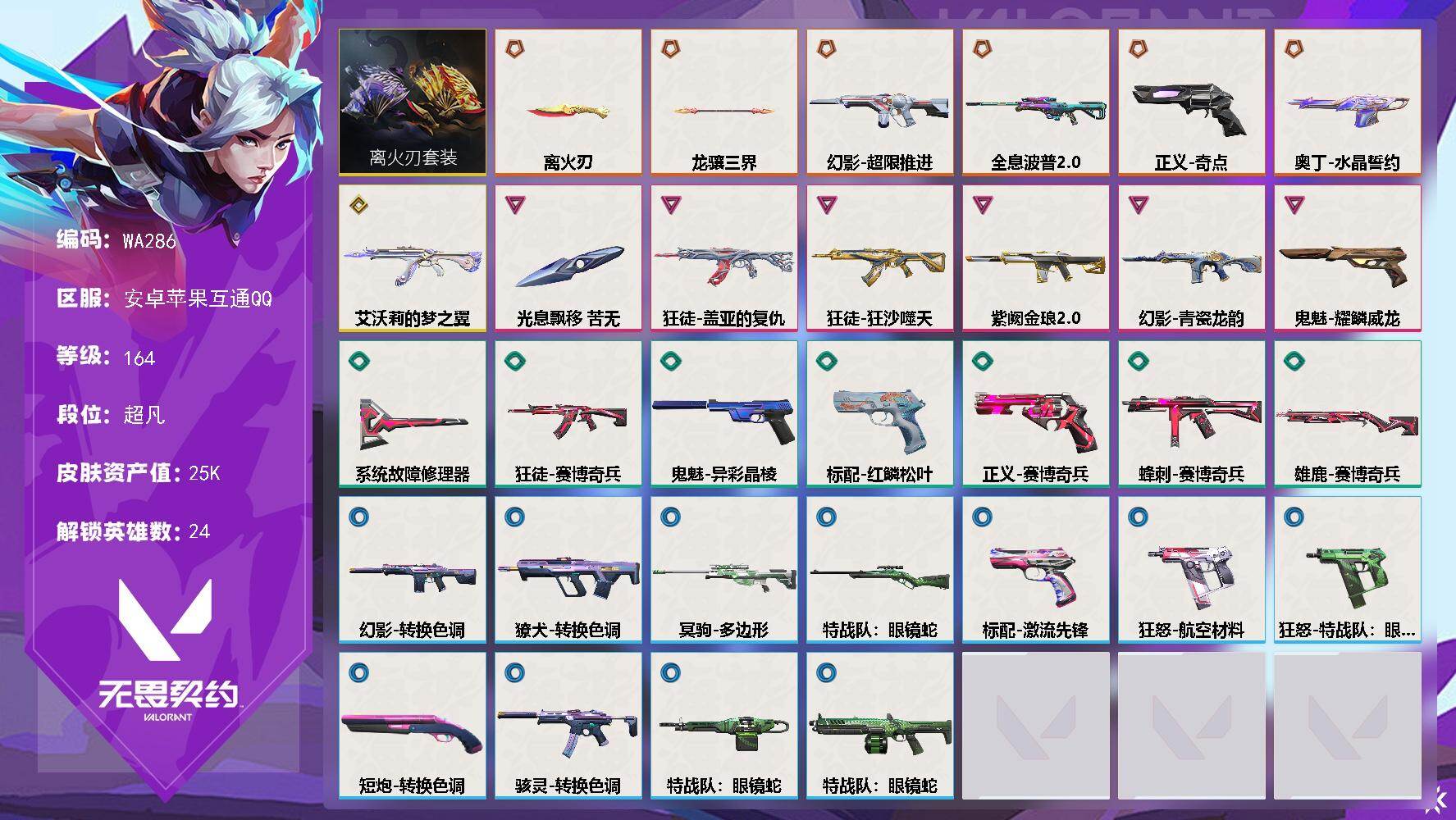 【英雄】:捷风,贤者,不死鸟,芮娜,猎枭,蝰蛇,雷兹,零,铁臂,斯凯,奇乐,炼狱,幽影,夜露,星礈,K/O,尚勃勒,霓虹,黑梦,盖可,钢锁,壹决,暮蝶,钛狐 【套装】:离火刃套装 【近战武器】:近战武器-荧光刀,近战武器-离火刃,近战武器-青瓷影,近战武器-剥皮小刀,近战武器-创世之弧,近战武器-澄湖潋滟 【狂徒】:狂徒-偃月苍龙,狂徒-光明哨兵,狂徒-水晶誓约,狂徒-狂沙噬天 【幻影】:幻影