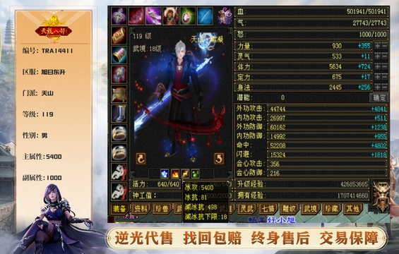 天山 | 等级:119 | 主属性:5400 | 副属性:1000 | 男 | 主冰攻 | VIP5 | 畅游账号