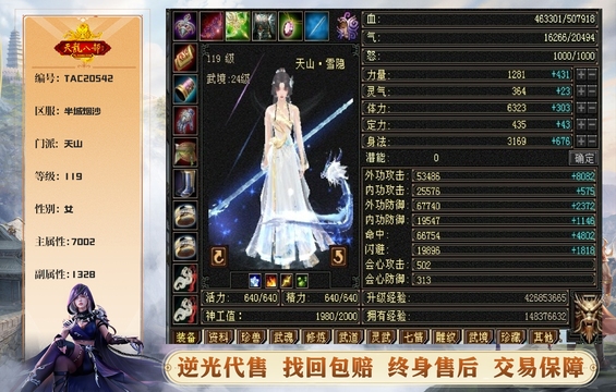 天山 | 等级:119 | 主属性:7002 | 副属性:1328 | 女 | 主冰攻 | VIP3 | 畅游账号