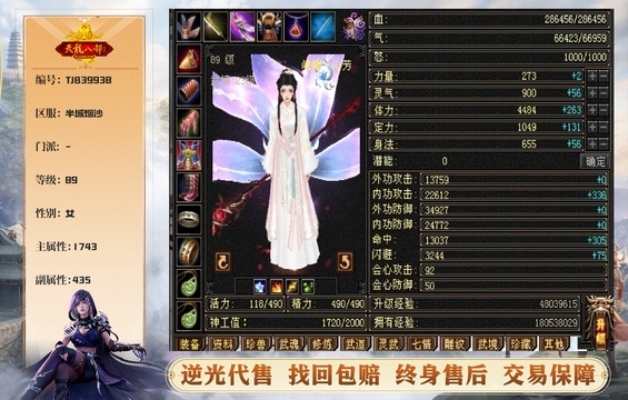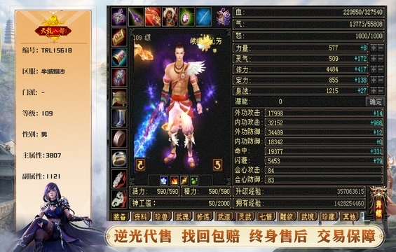 3800主属性,900副属性,打怪6万多刷副本贼给力带宝宝元宝金币一起出截图啥样就啥样,这个号天命还有一个2800属性的4级星宿号89级的