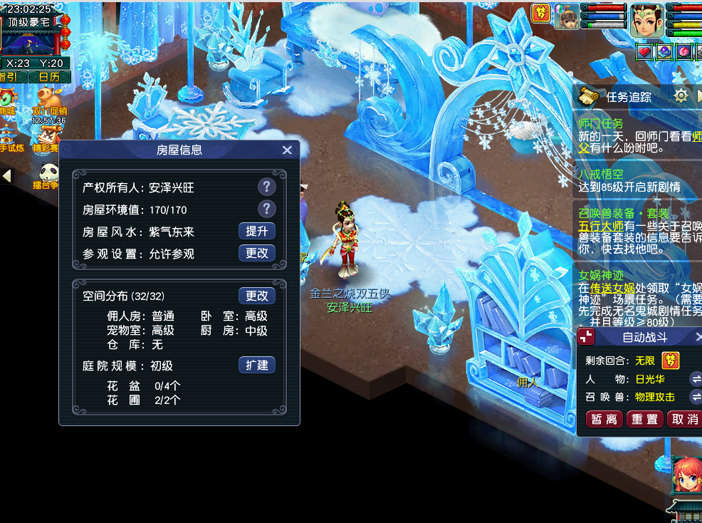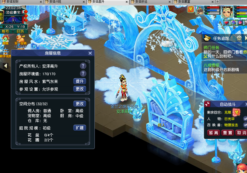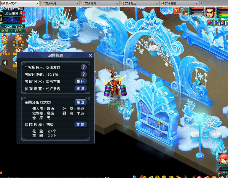 三座紫气豪宅,三套雪之缘永久,1天阵4雷阵,剧情变身定旗宝石做房什么都有,所有的号均有房子均有练兽笼和飞行坐骑