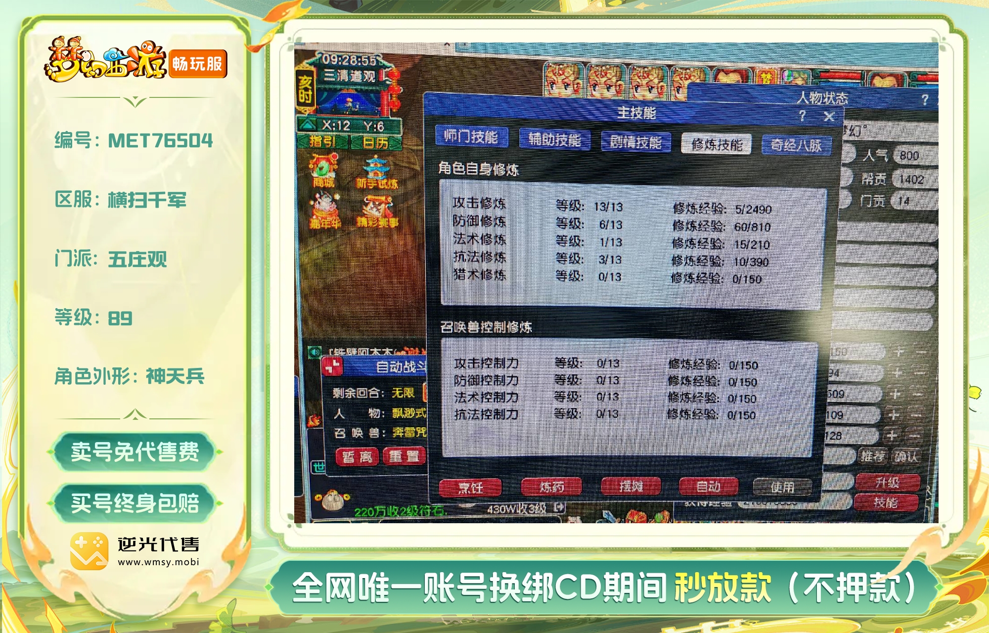 一组自己注册的89级号,每个号2亿多经验。人物满修,有自己帮派随时点修。储备2000万每个号。副本通刷,没时间玩了。上号通刷!