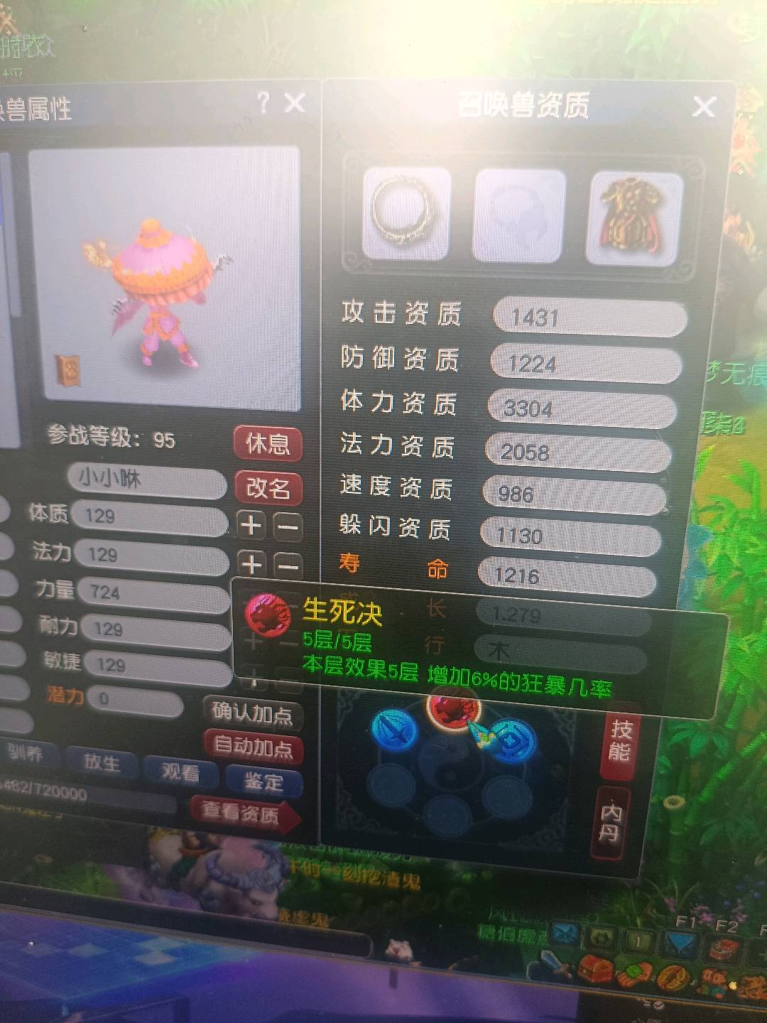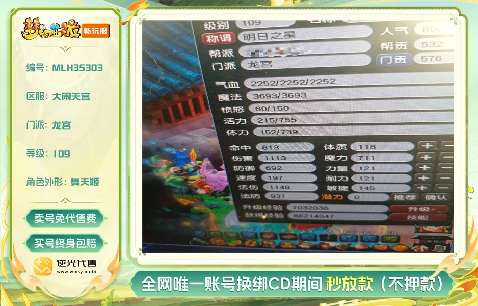 一线龙宫,满修,满段定心套,宝宝修。宝宝,天阵,紫气家园,该有的细节都有,难度副本通刷,总经验8亿多,副本积分一万二,不清一个东西,年前要忙没时间玩了,号品好,不缺一起玩的好友。(定心套➕宝宝随便值四五千吧,不想拆号卖!)最后卖一天,晚点直接拆开卖空号了
